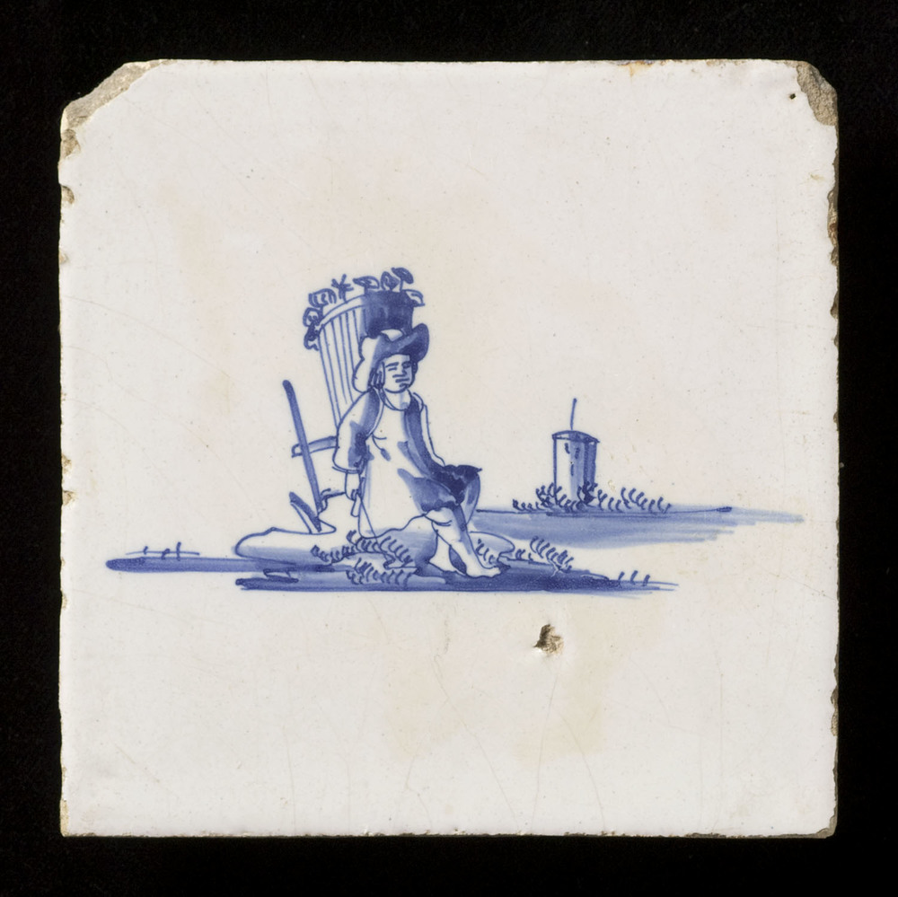 Tegel in tinglazuur, voorstellende pijpenkoopman met...