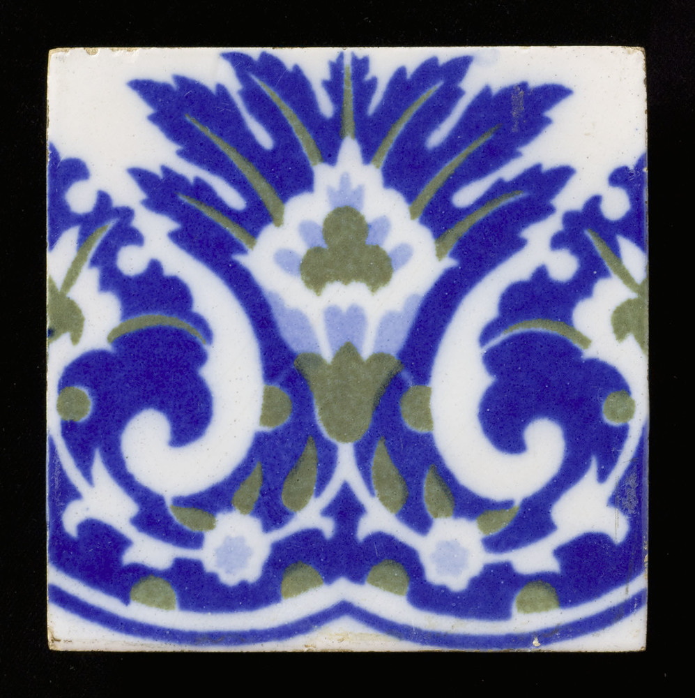 Randtegel in tinglazuur, gesjabloneerd, voorstellend...