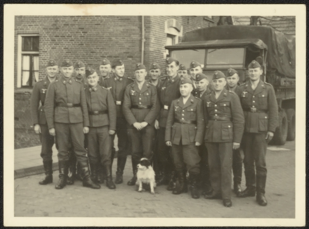Groepsfoto van Luftwaffe militairen met hond bij een...