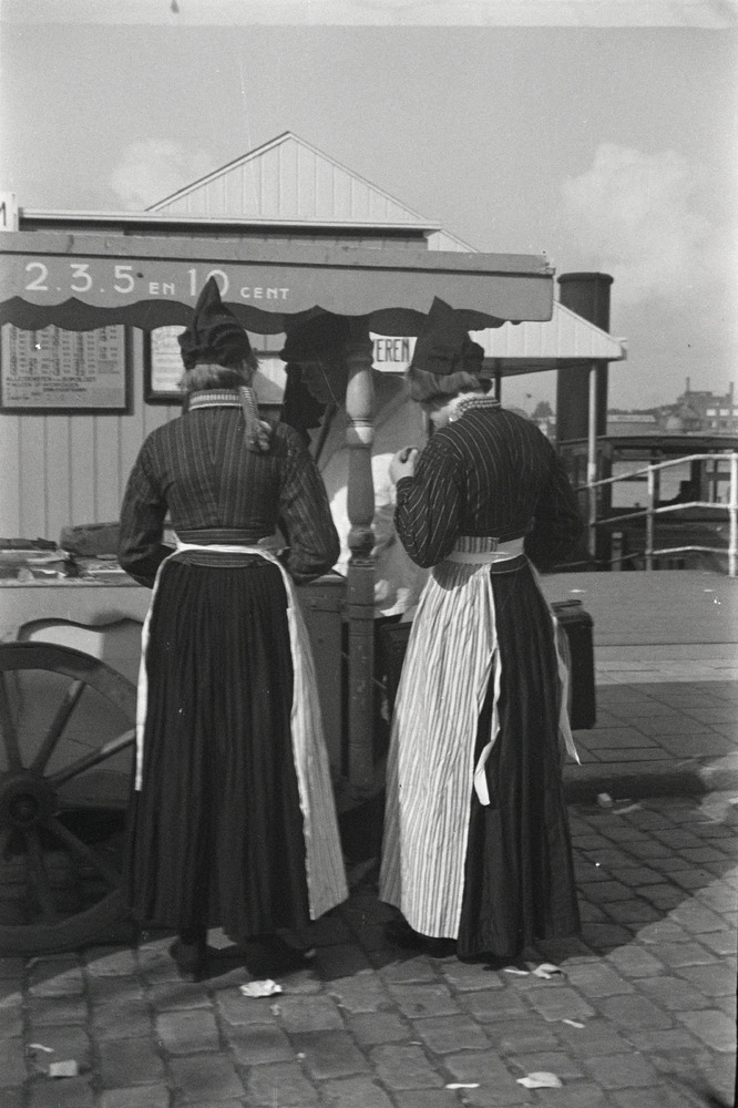 Twee vrouwen in klederdracht staan bij een ijskar op...