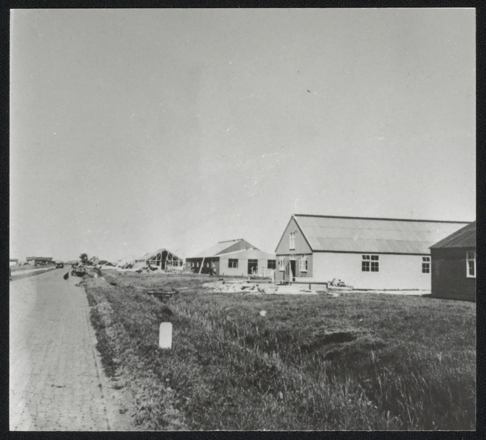 Rij nieuwe gebouwen langs een straatweg in aanbouw.
