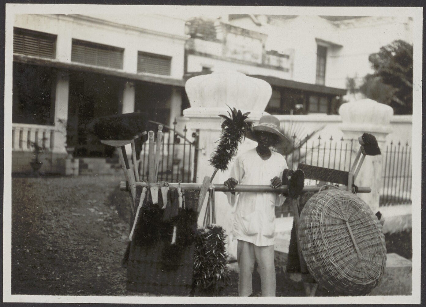 Javaanse marskramer biedt bezems, manden en matten t...