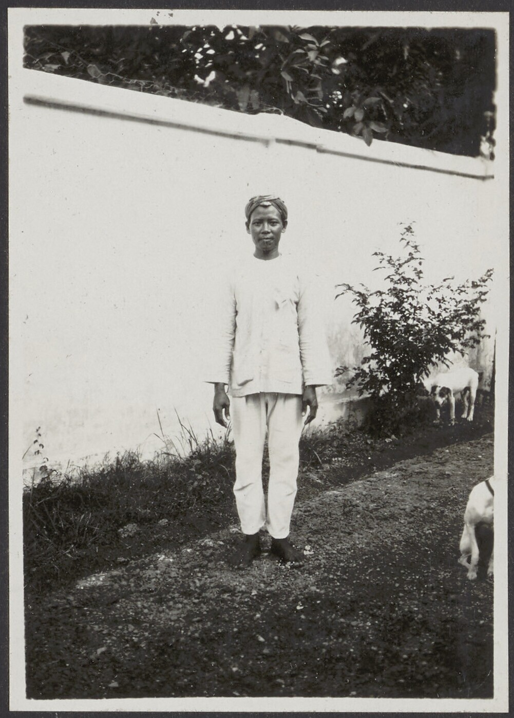 Javaanse man met hond voor de muur in de tuin