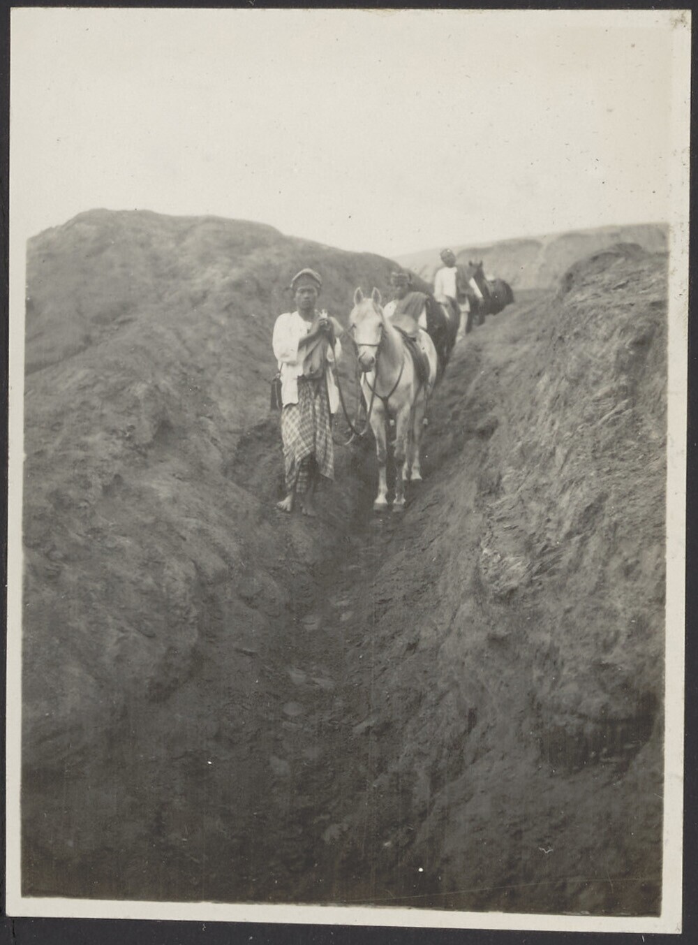 Javaanse mannen en paarden onderweg in een soort gre...