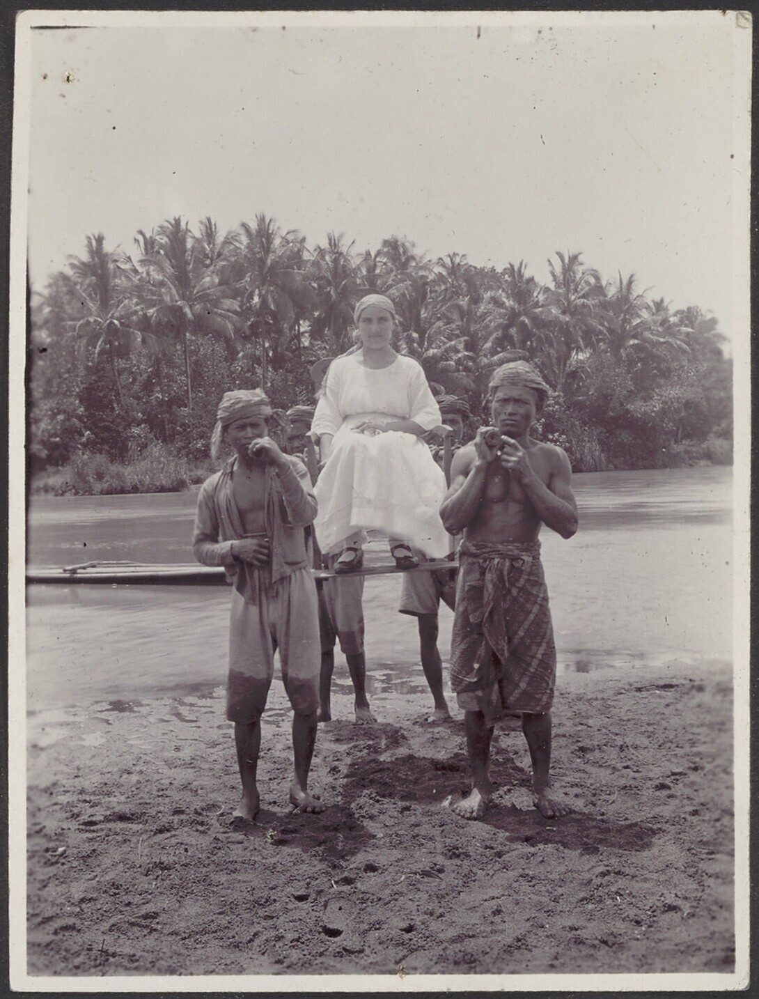 Europese vrouw in draagkoets, gedragen door acht Jav...