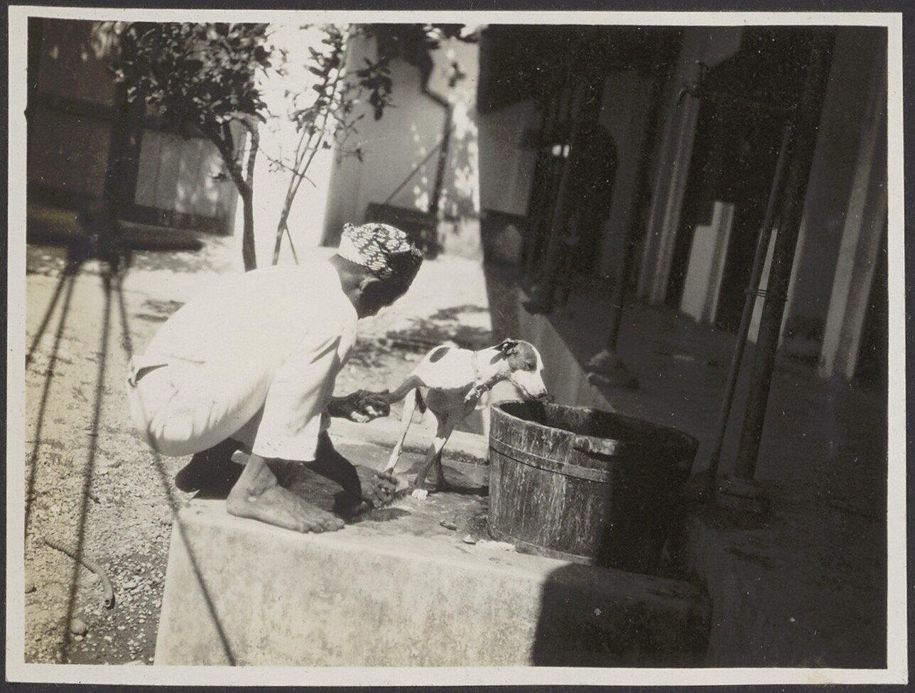 Een Javaans lid van het huispersoneel wast de hond i...