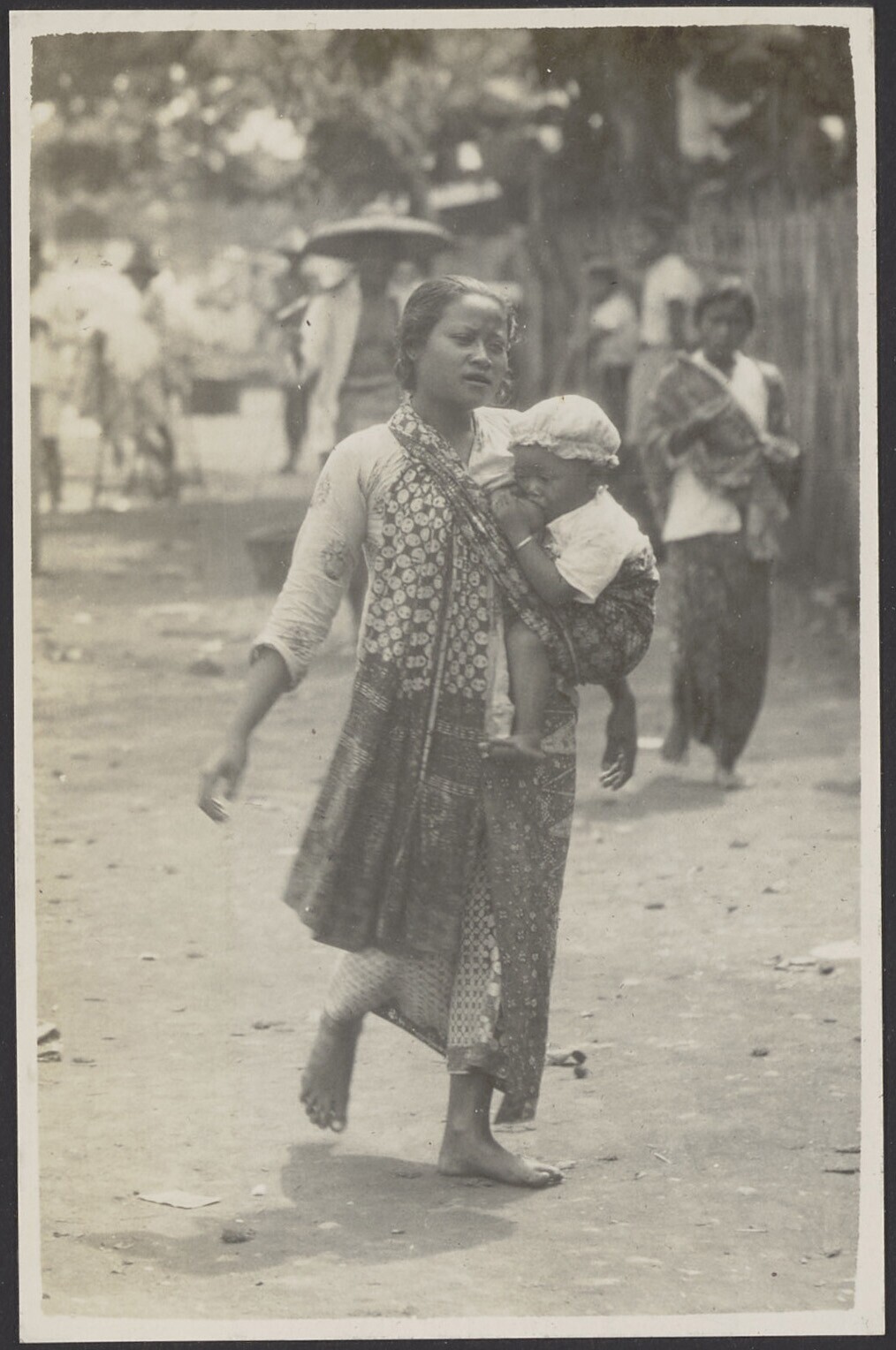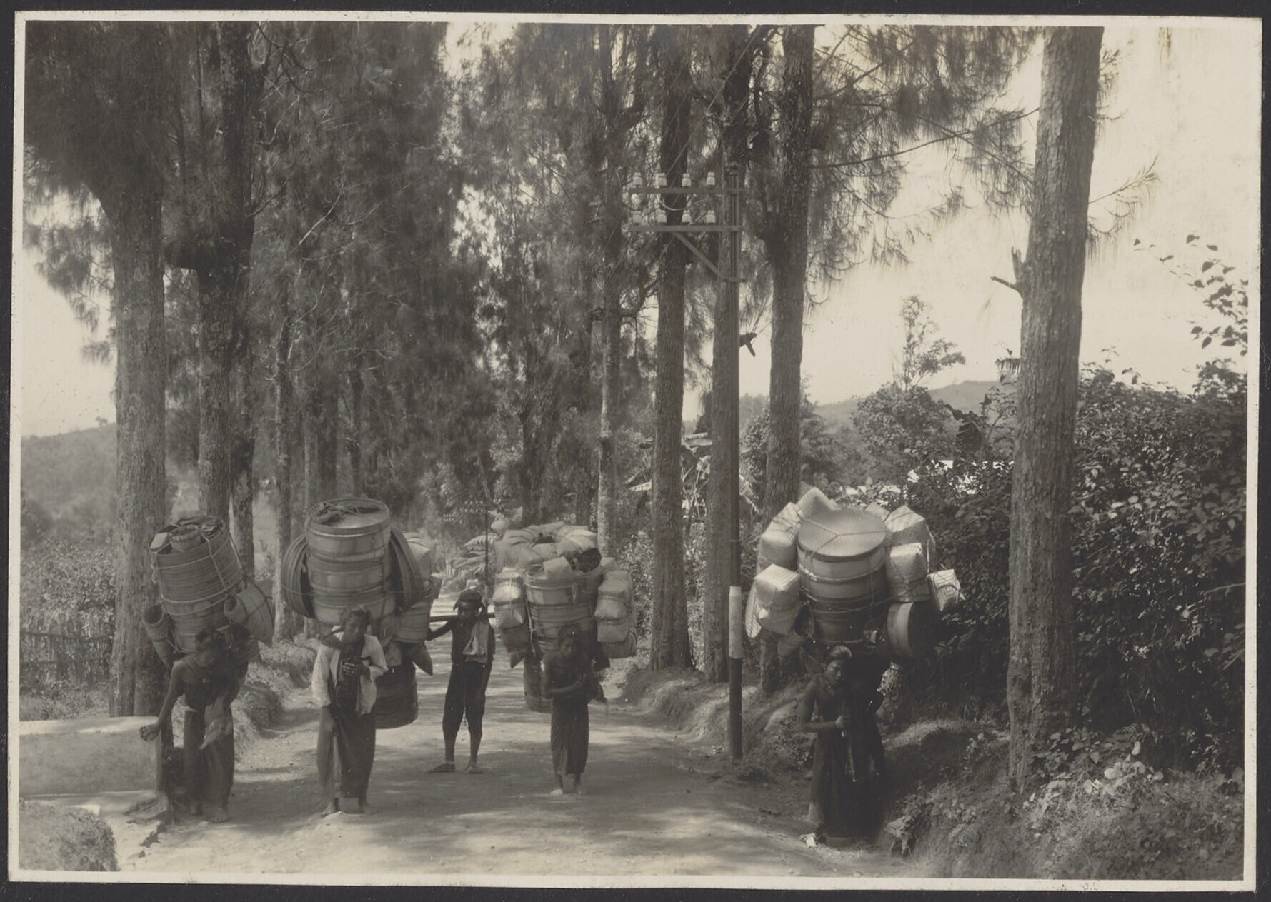 Javaanse vrouwen en een man onderweg met hun handels...