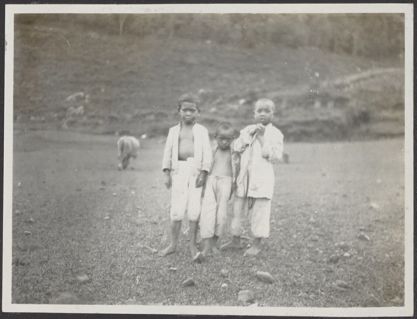 Drie Javaanse kinderen staan in het gras
