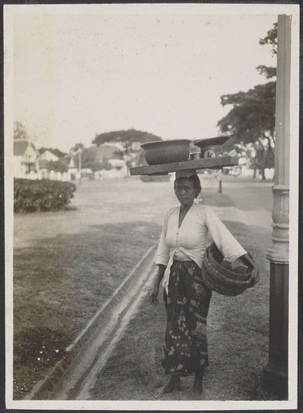 Javaanse vrouw draagt kookpotten op haar hoofd