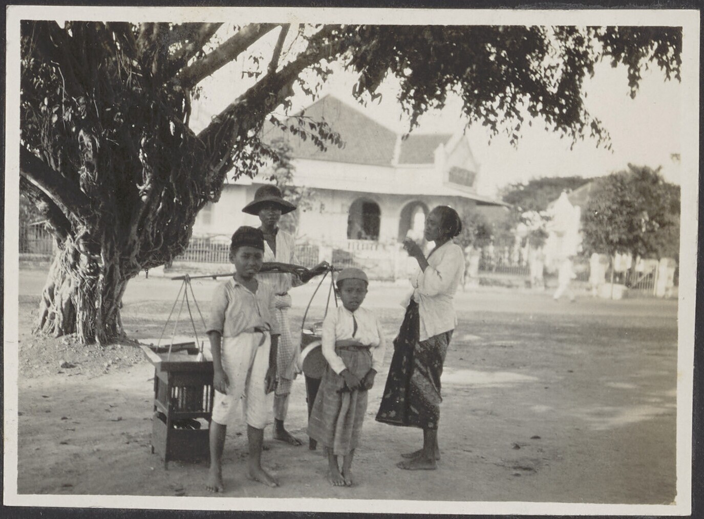 Javaanse mannen bijeen bij een marskramer op de straat