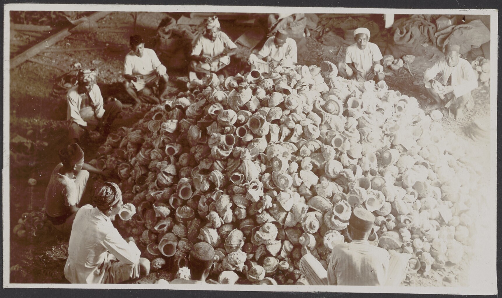 Javaanse mannen bewerken de grote schelpen