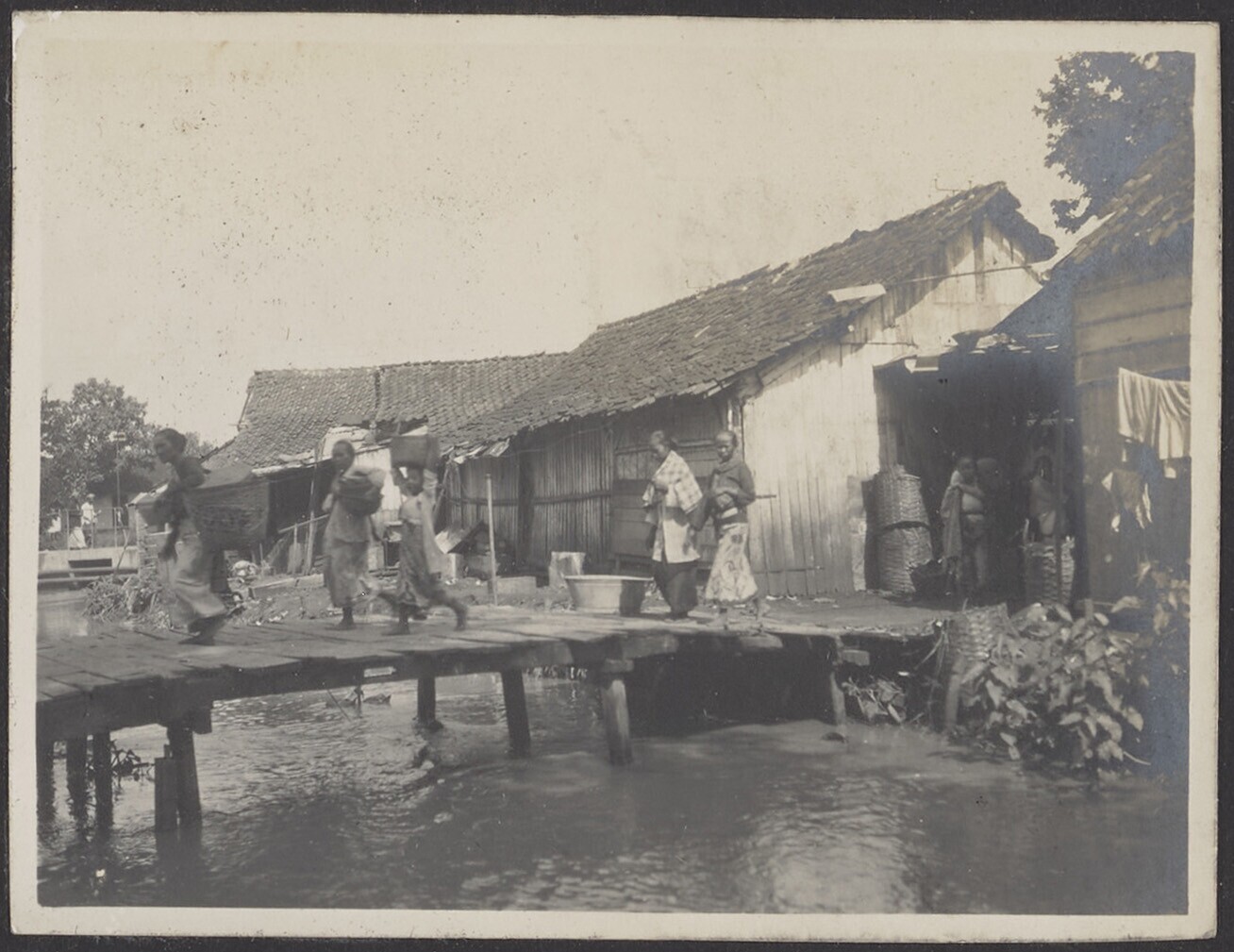 Javaanse vrouwen lopen over de brug over de rivier i...