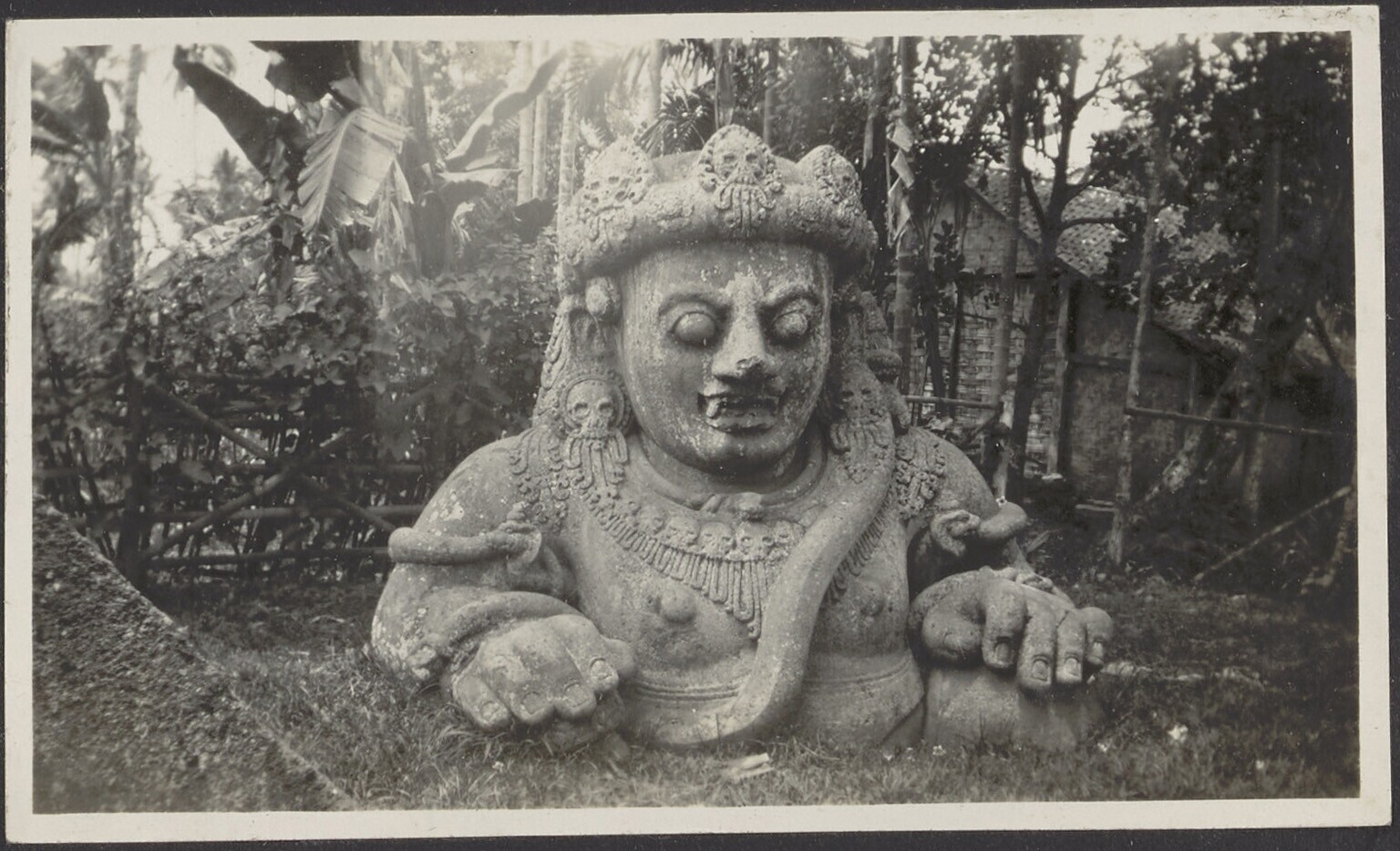 Een beeld van één van de goden in het gras in een dorp