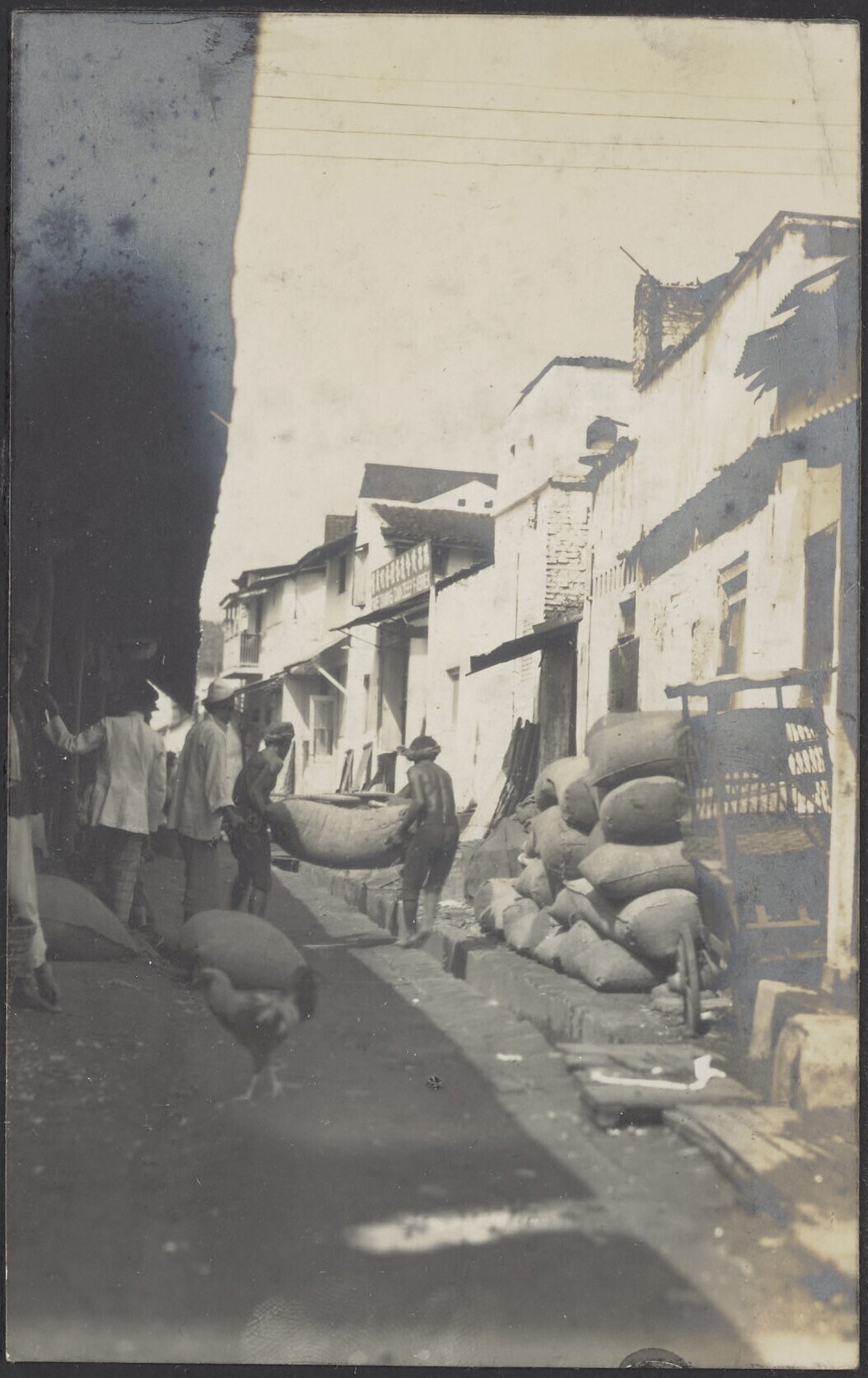 Javaanse mannen dragen rijstbalen naar een opslagpla...