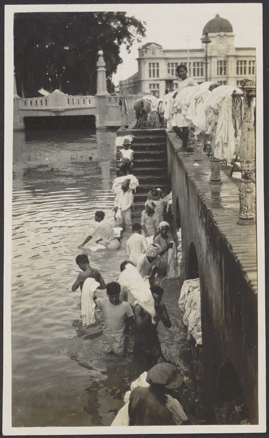 Javaanse mannen wassen hun kleren langs de kade in d...