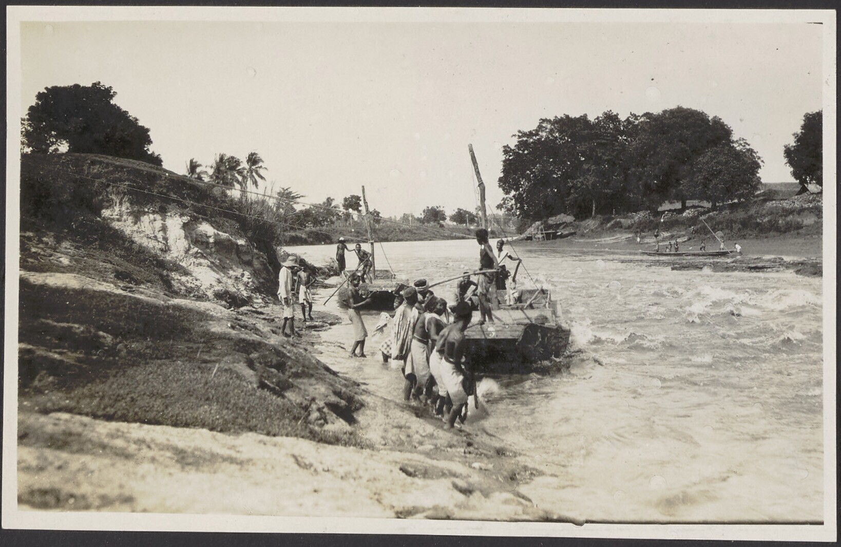 Het stroomopwaarts trekken en duwen van boten op de ...