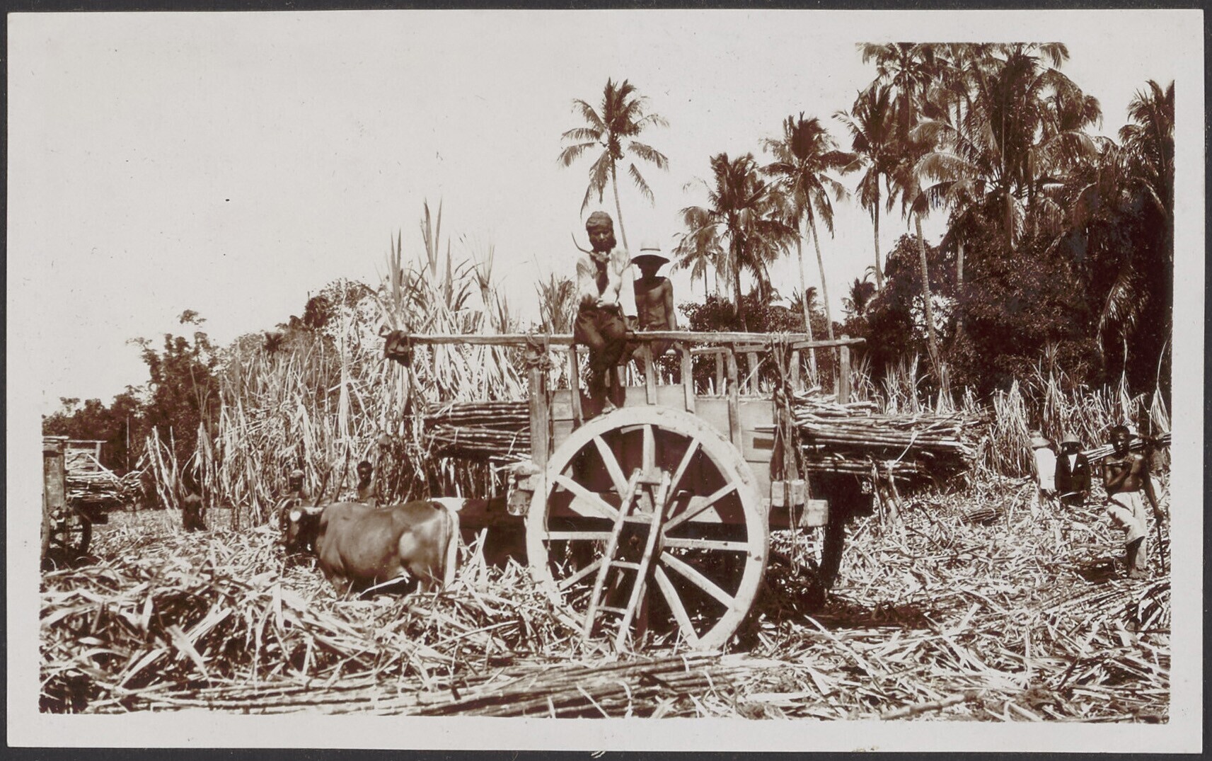 Javaanse landarbeiders oogsten het suikerriet op het...