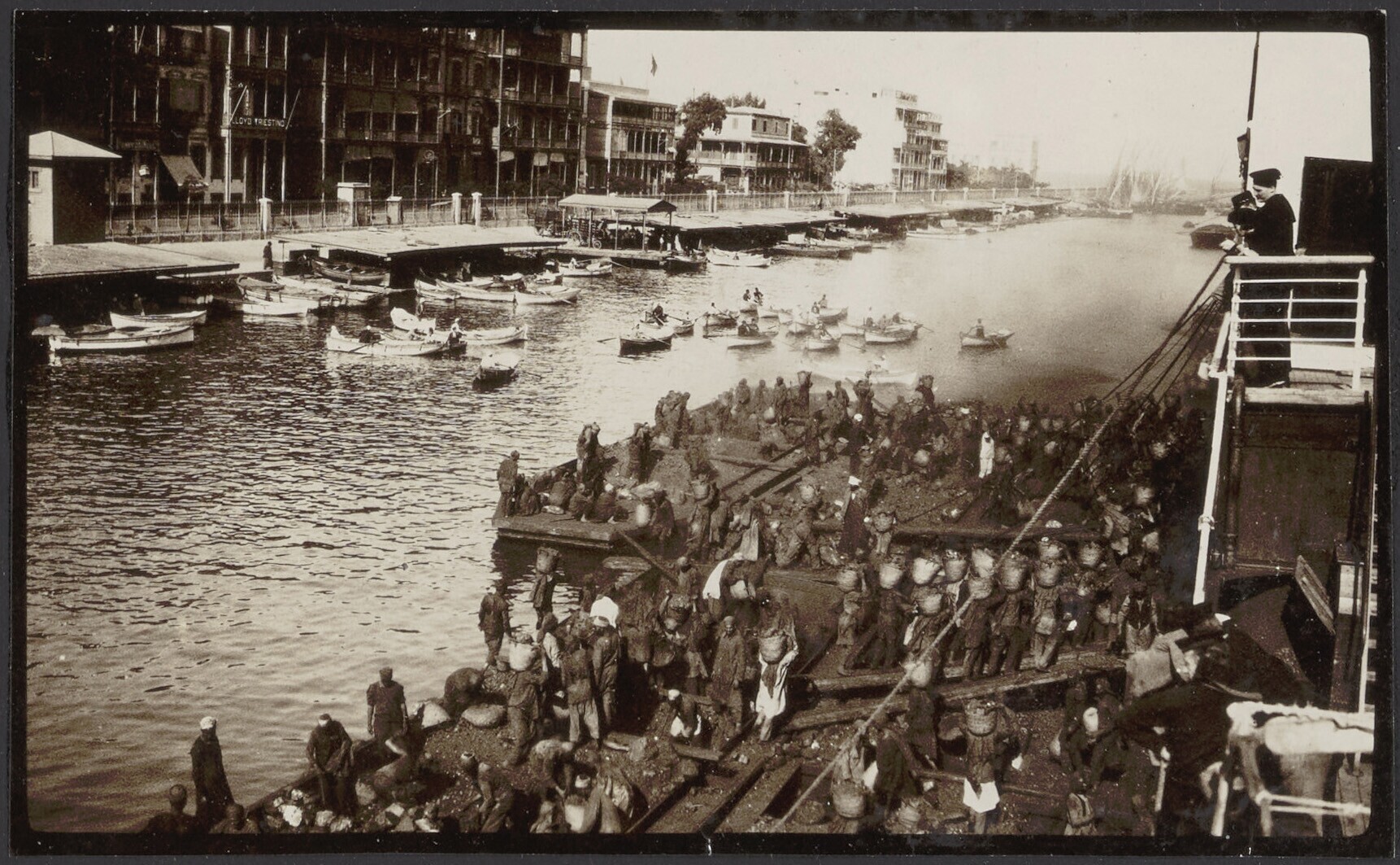 De handelsbootjes liggen langszij de ss. Saarbrücken