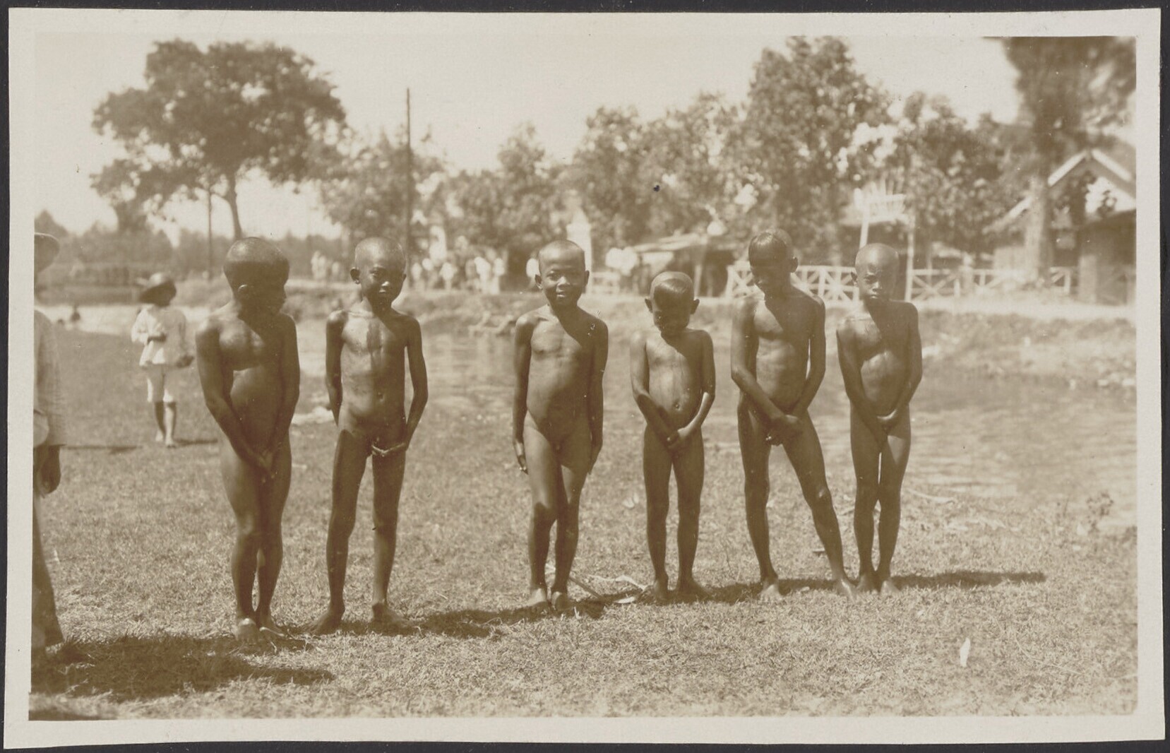 Kinderen met verzorgsters op grasveld