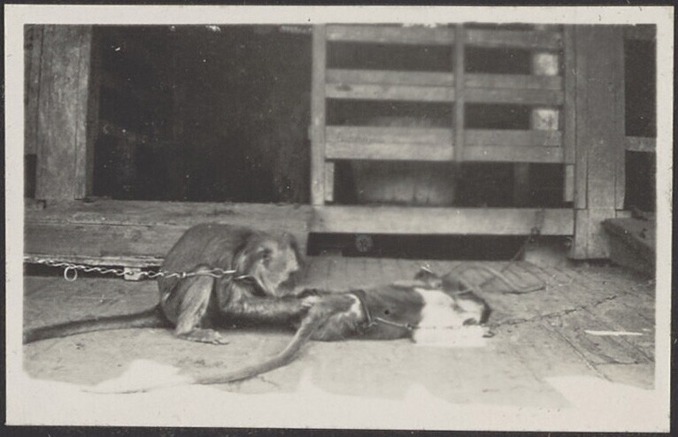 Europese vrouw geeft aapje een hand op straat