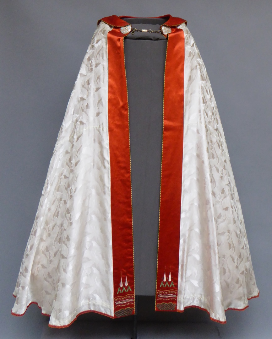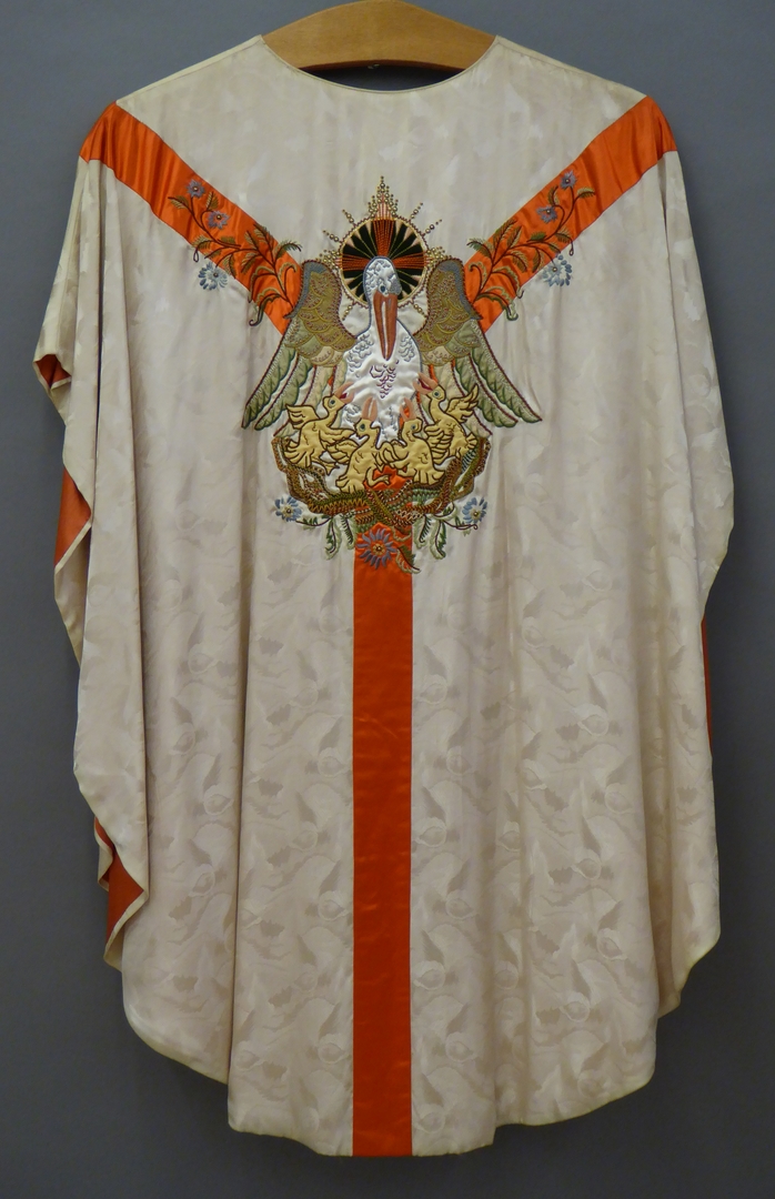 Wit kazuifel met oranje gaffelkruis waarop pelikaan
