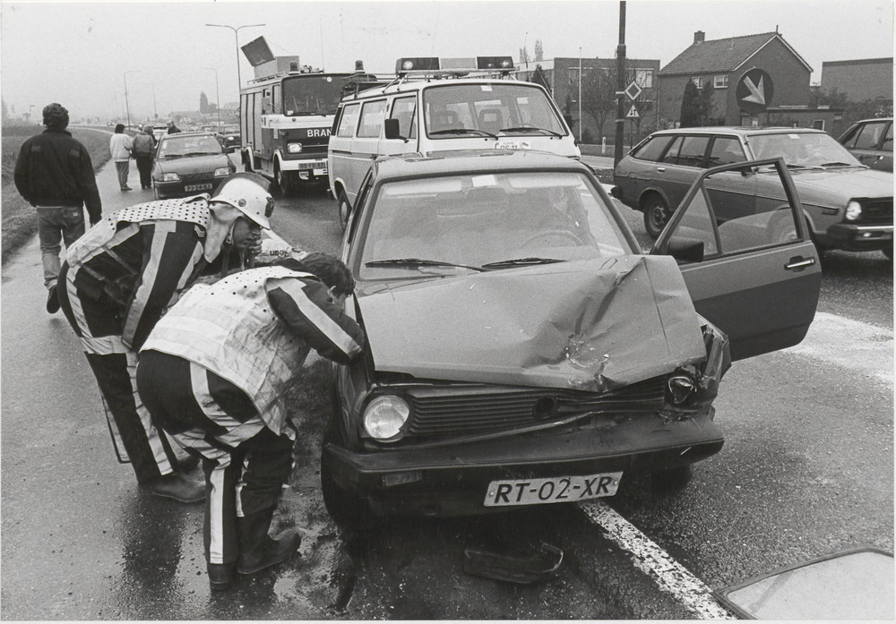 Een aanrijding, brandweerlieden controleren de auto,...