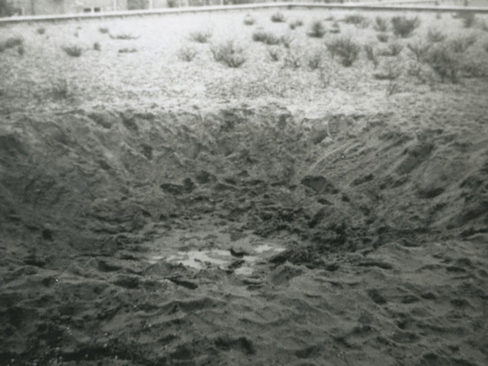 Foto van krater na bominslag in veld. Tekst achterop...