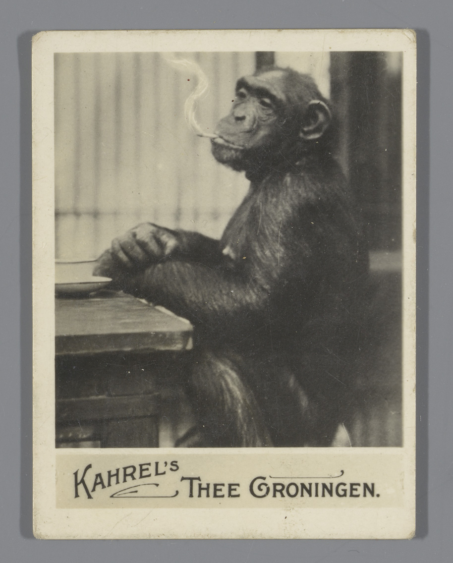 Rokende chimpansee, reclame voor Kahrel's Thee Groni...