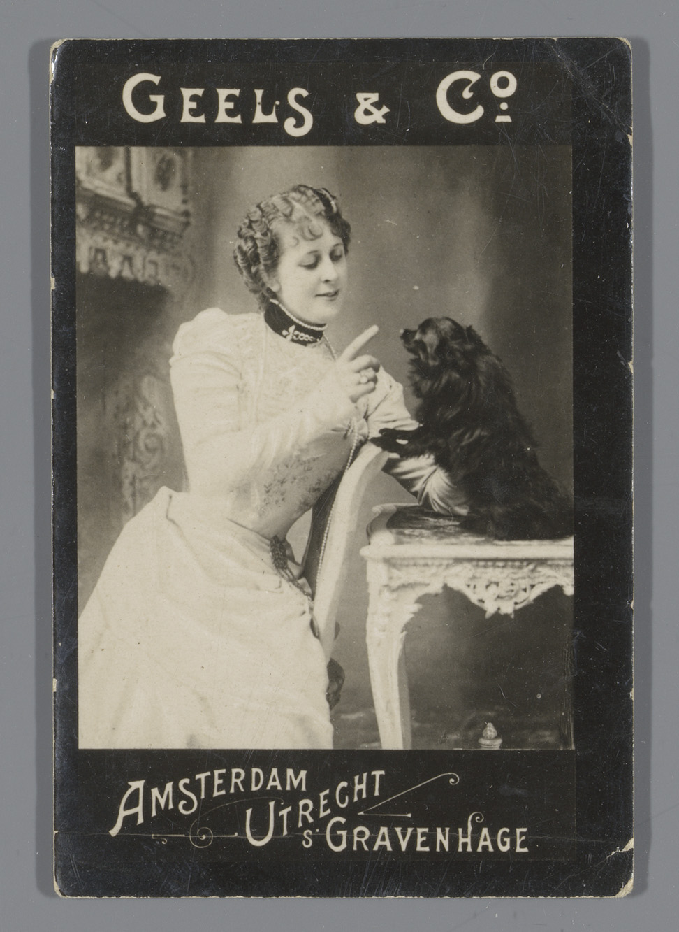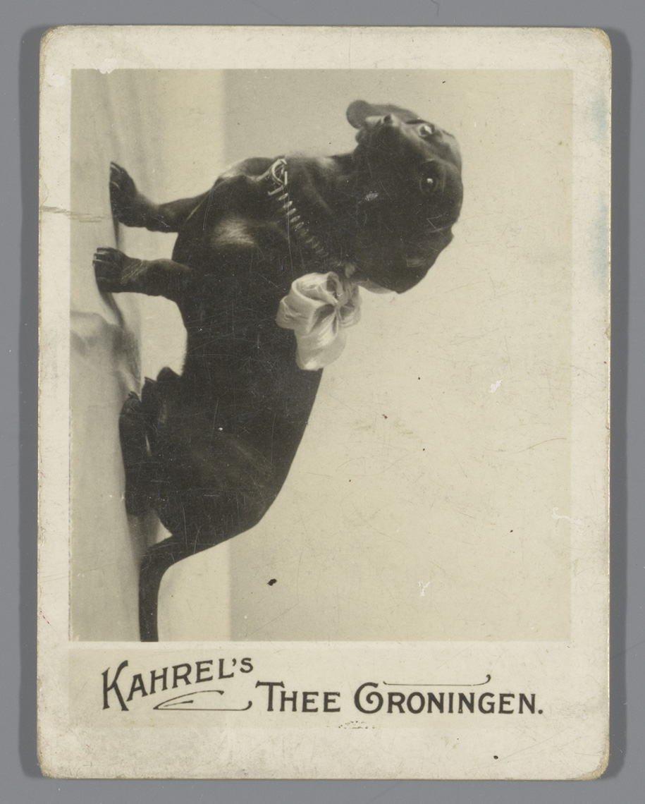 Hond met strik, reclame voor Kahrel's Thee Groningen