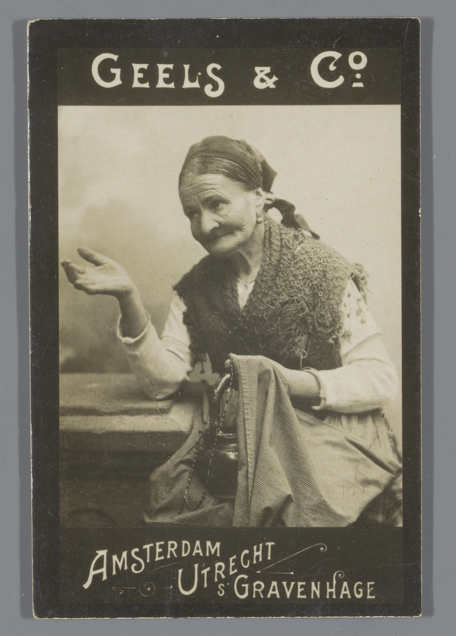Onbekende bejaarde vrouw met een theepot, reclame vo...