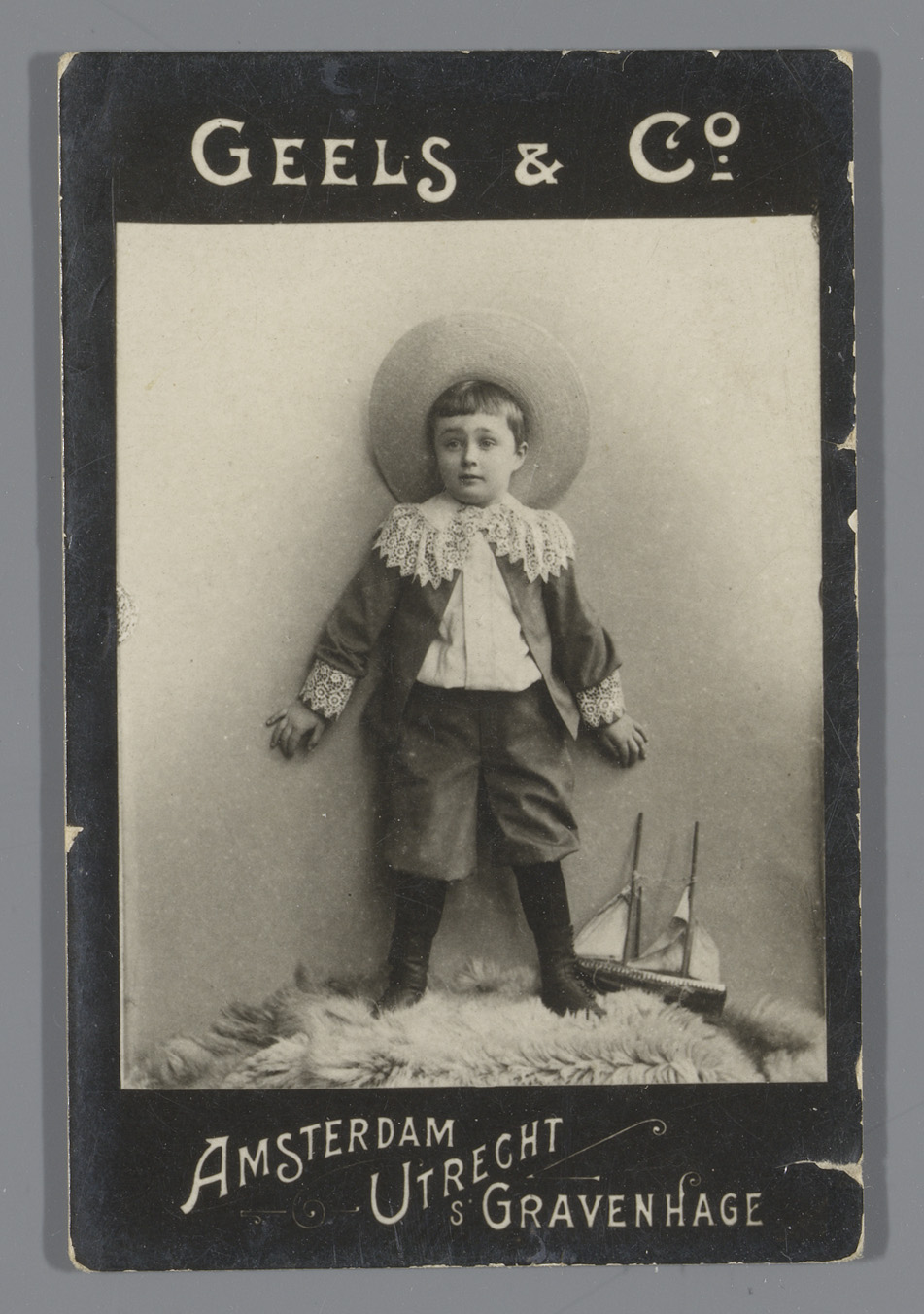 Onbekende jongen met hoed staande op een dierenvel, ...