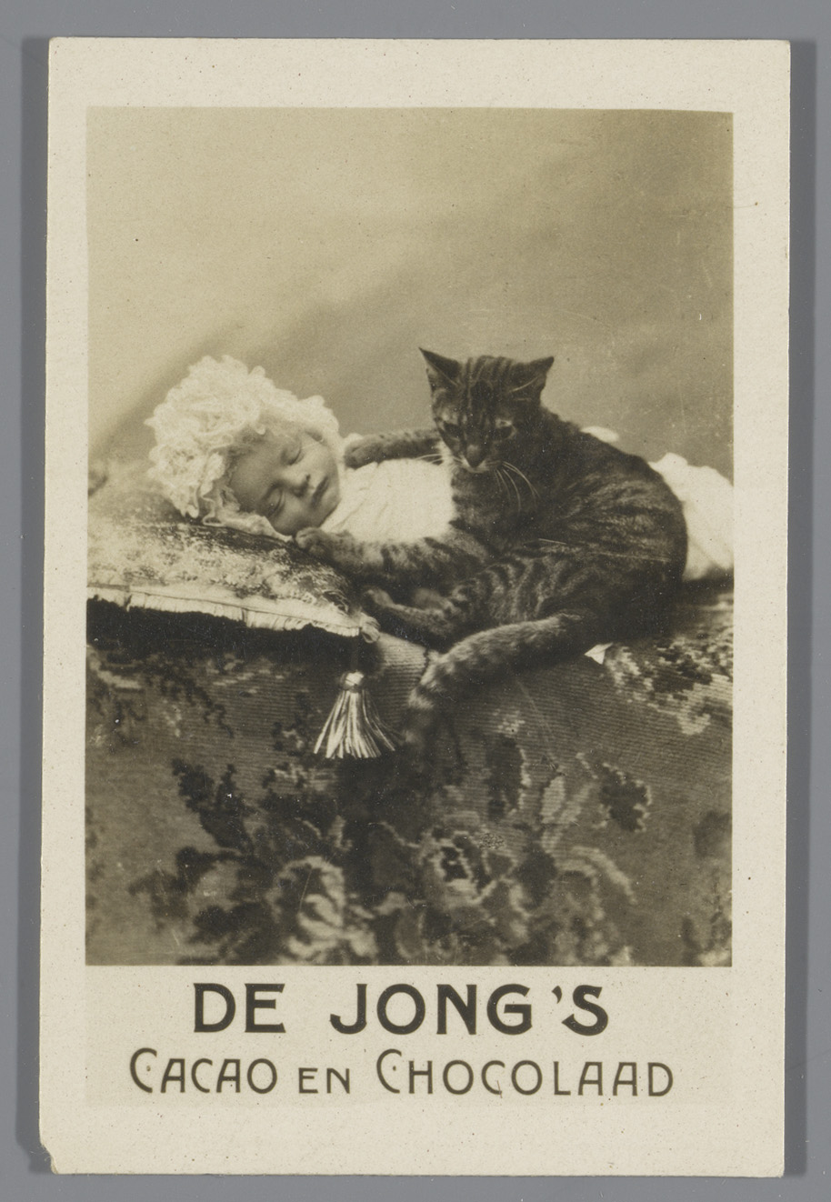 Poes bij slapend kind, reclame voor de Jong's cacao ...