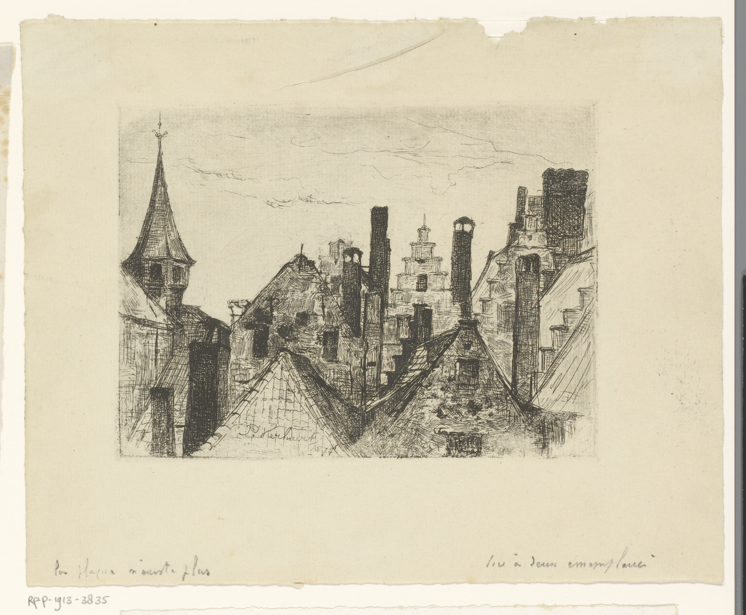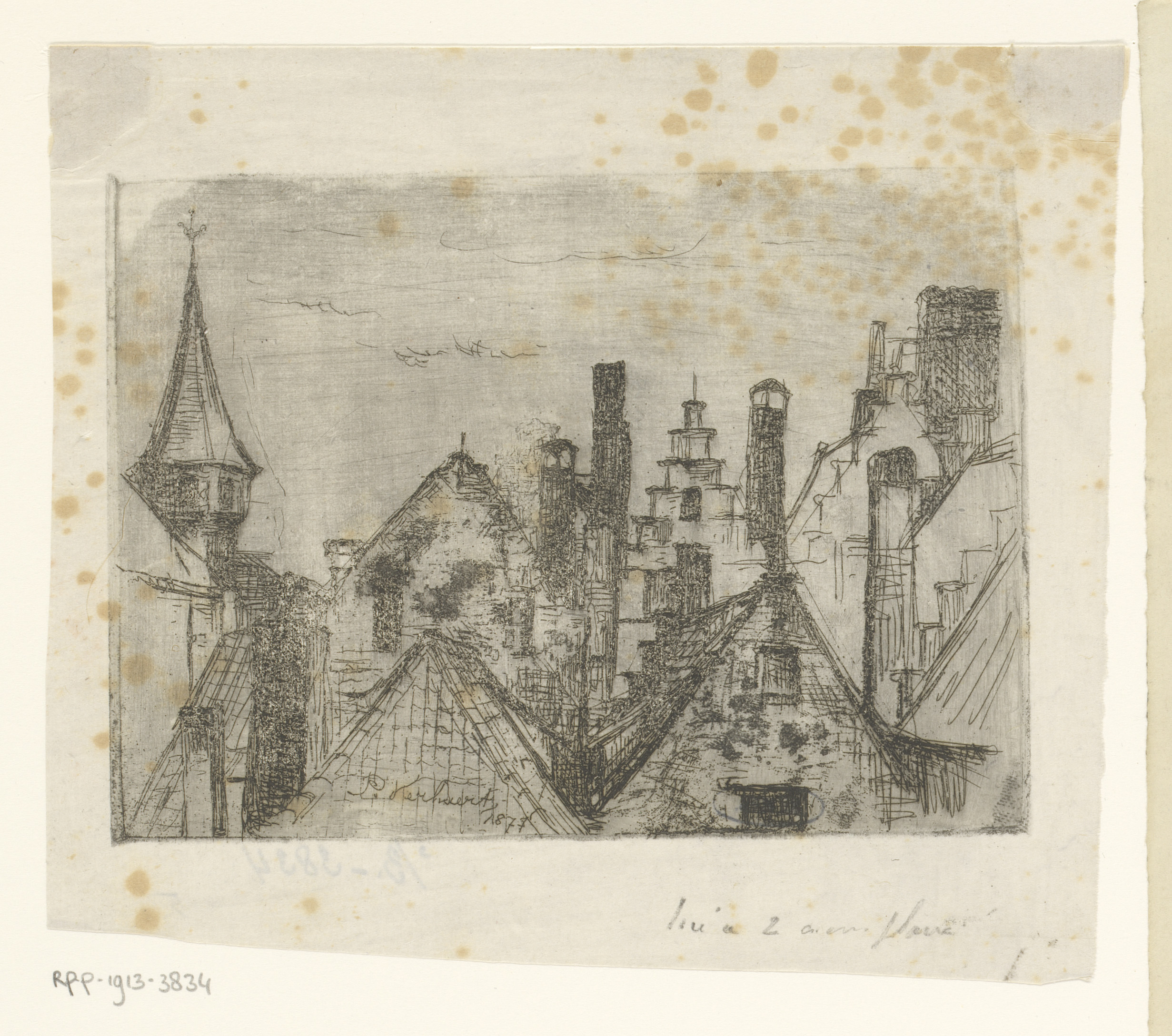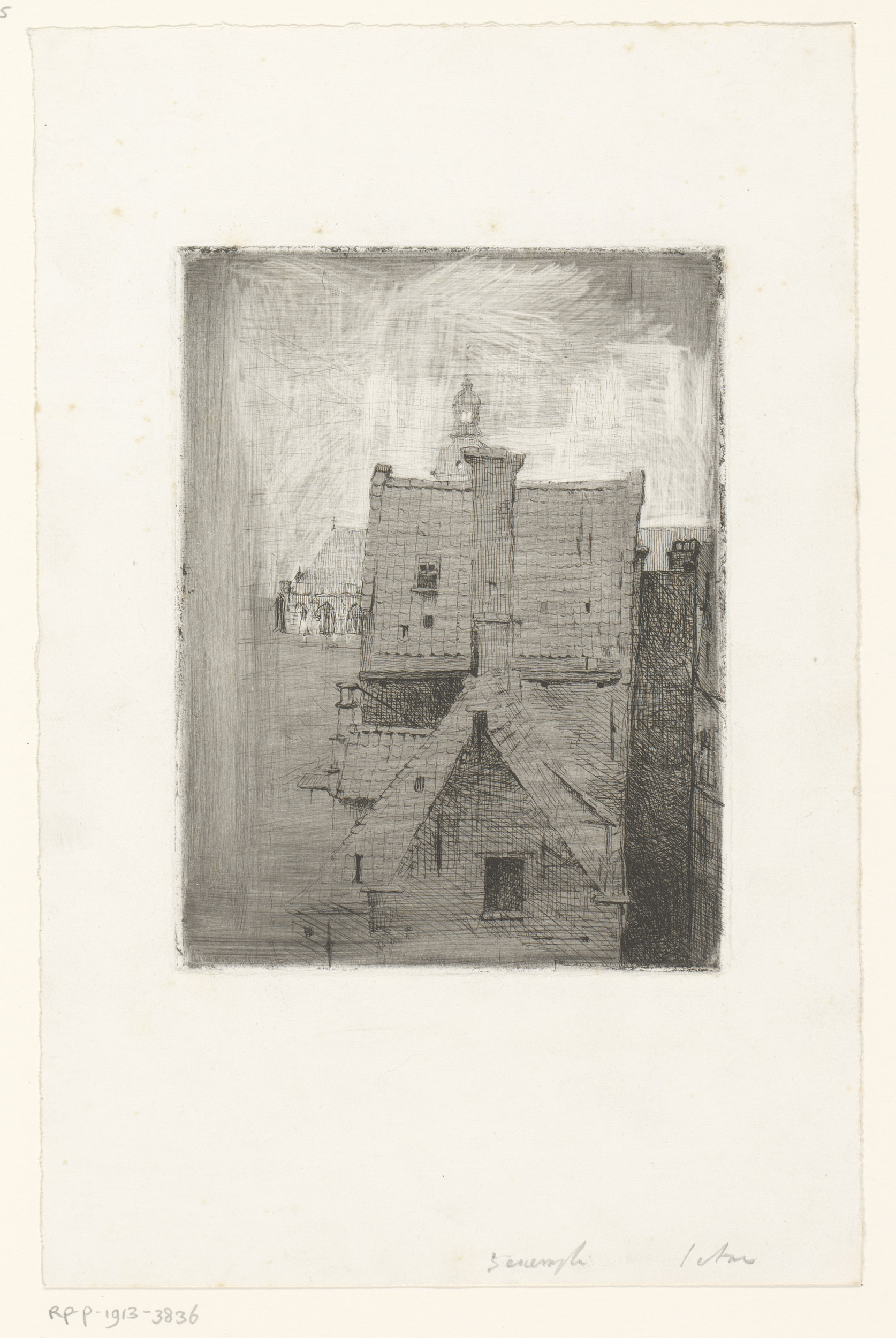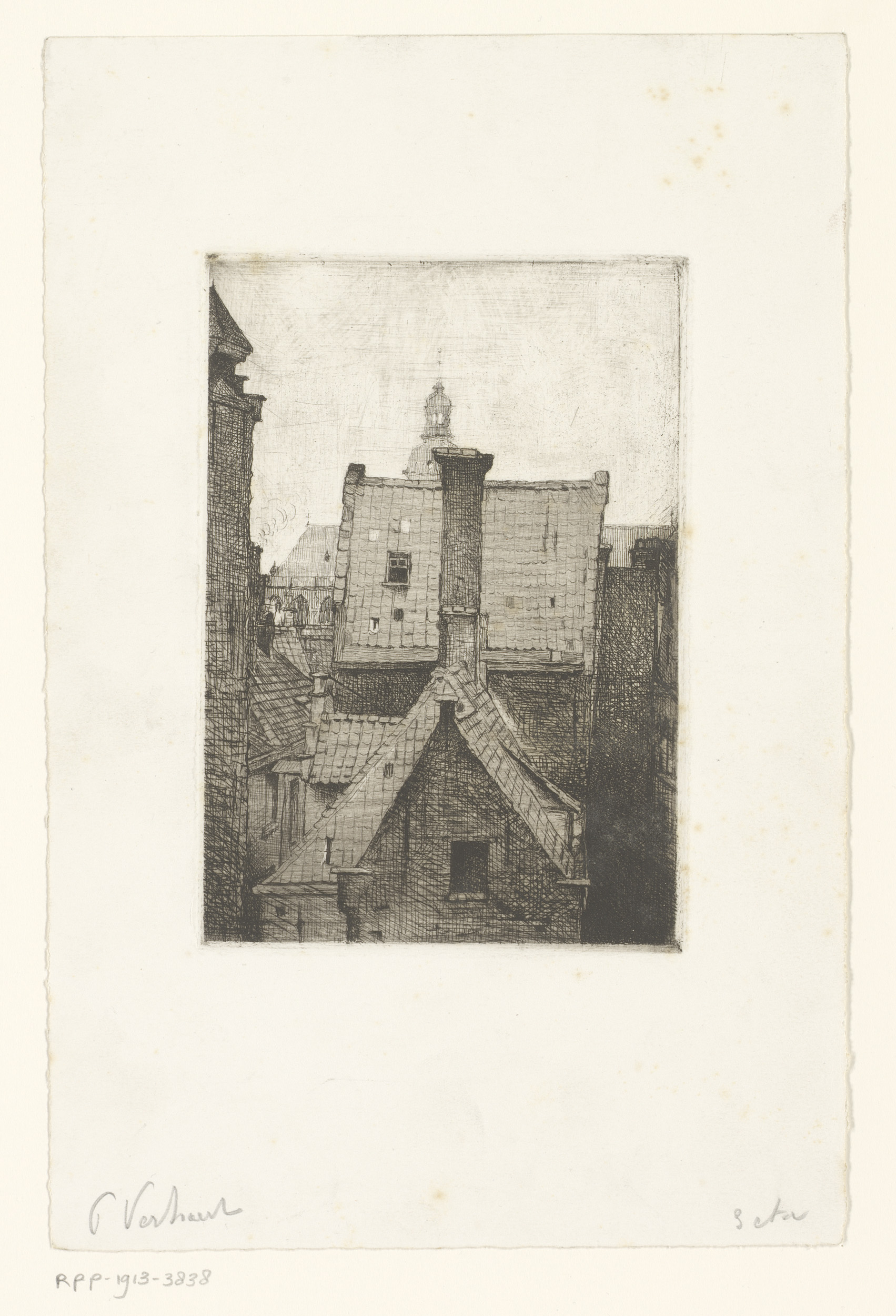 Gezicht op daken met een schoorsteen, op de achtergr...