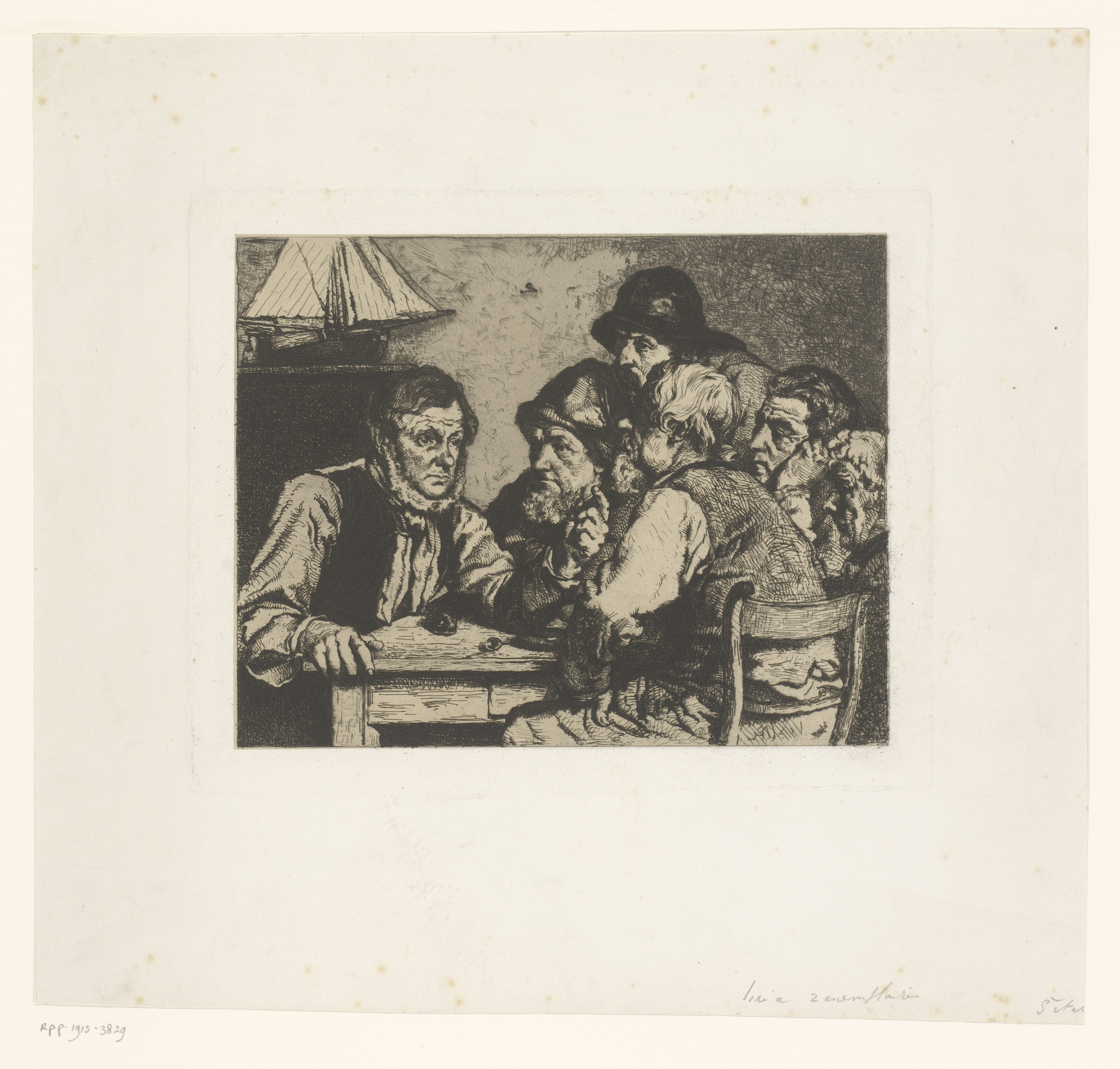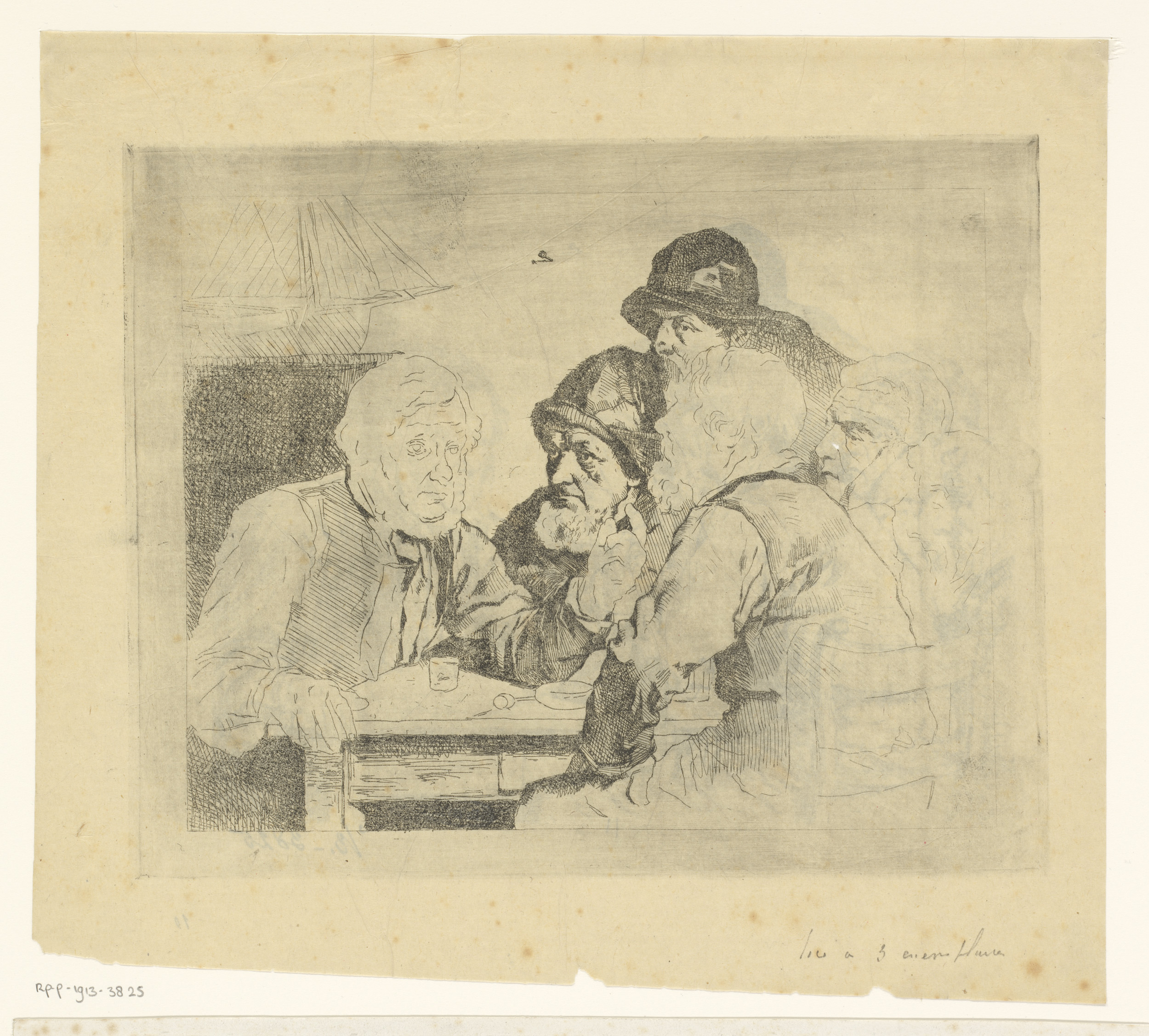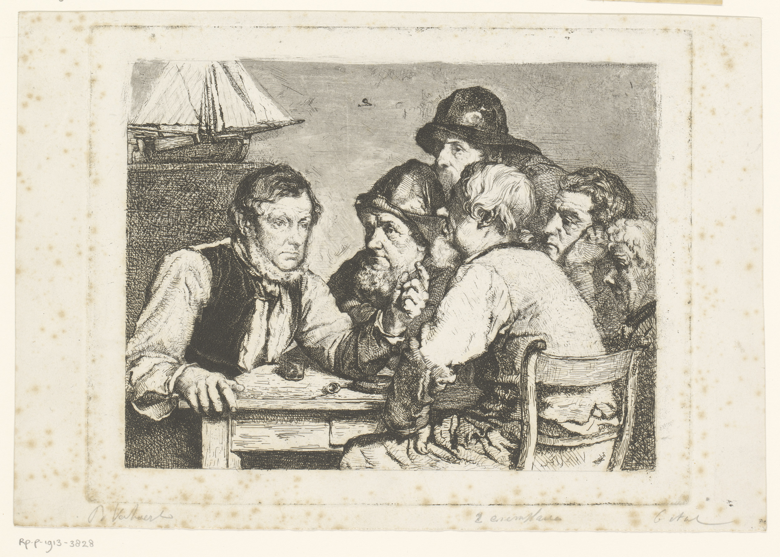 Zeelieden gezeten aan tafel luisterend naar een van hen