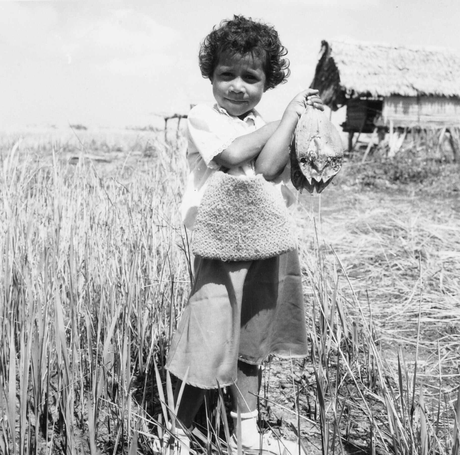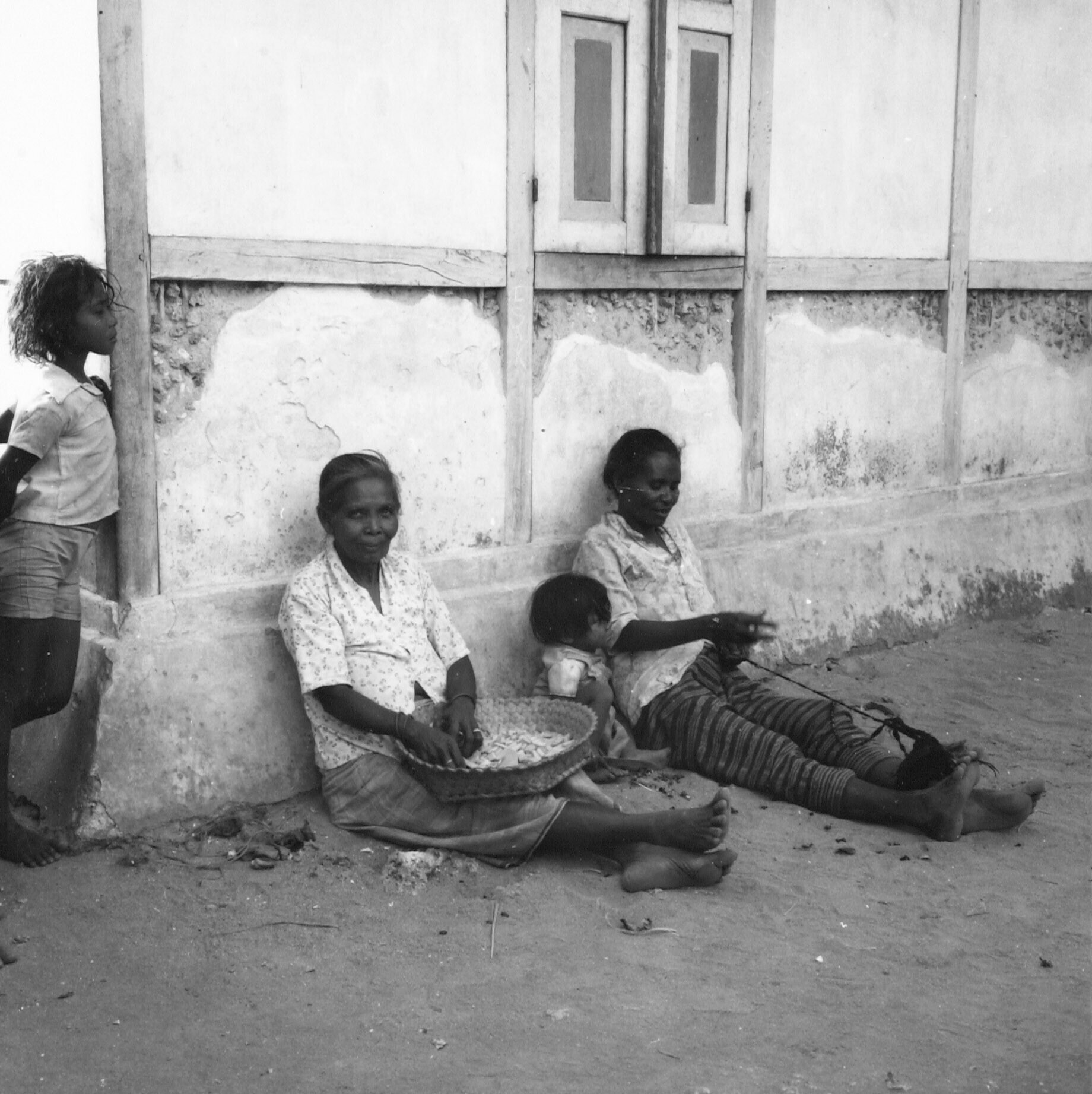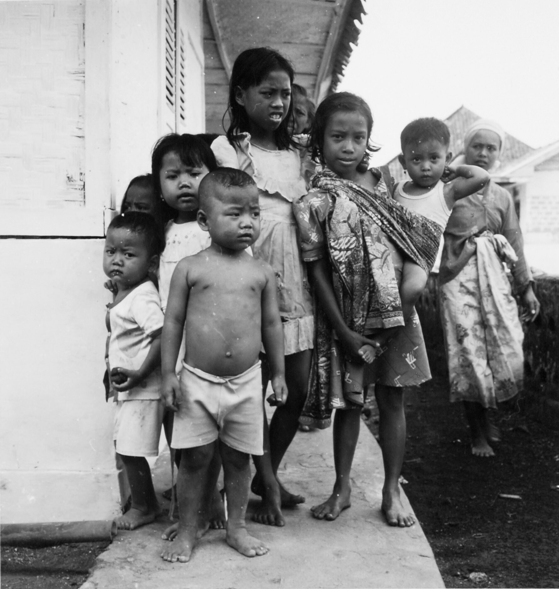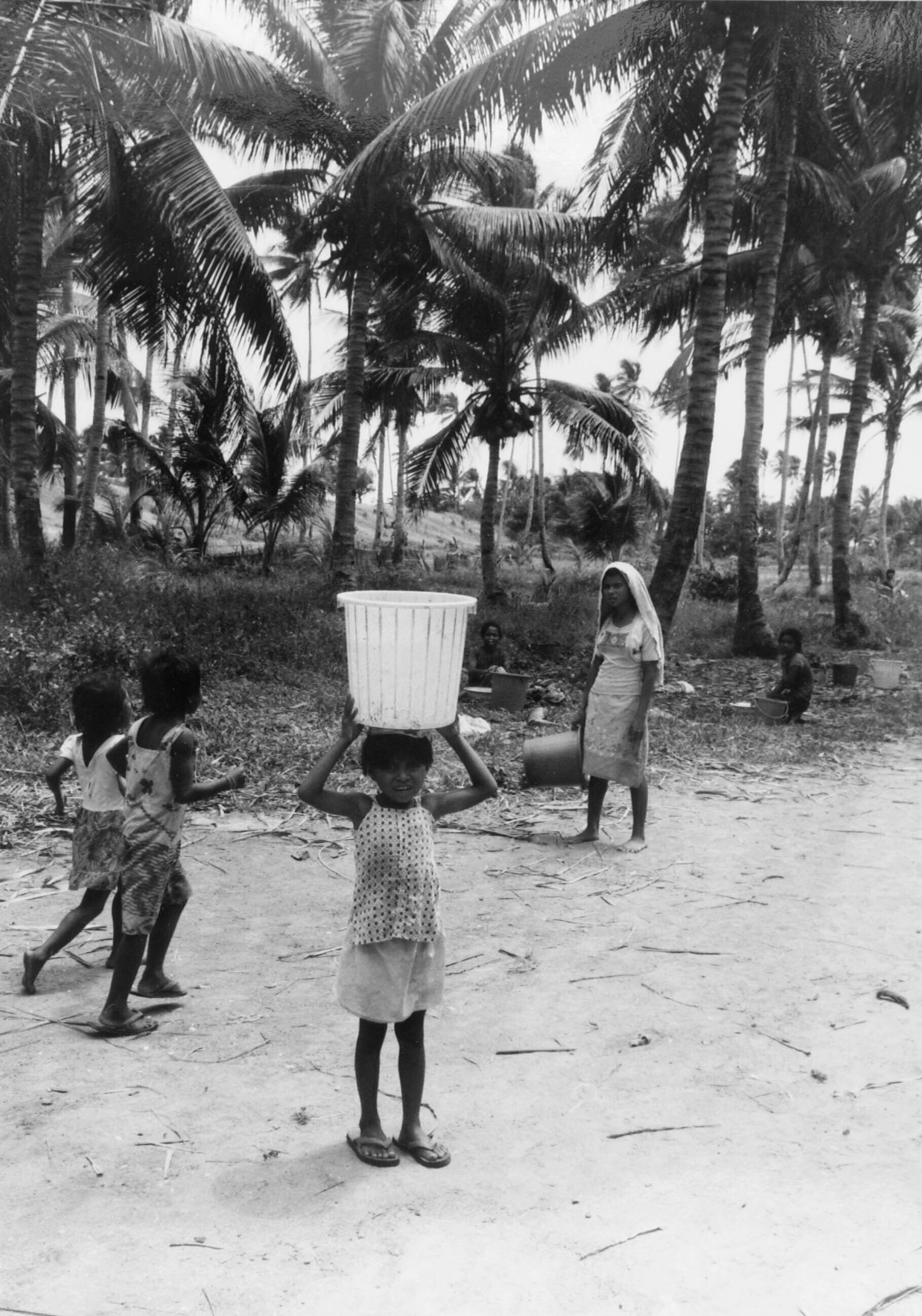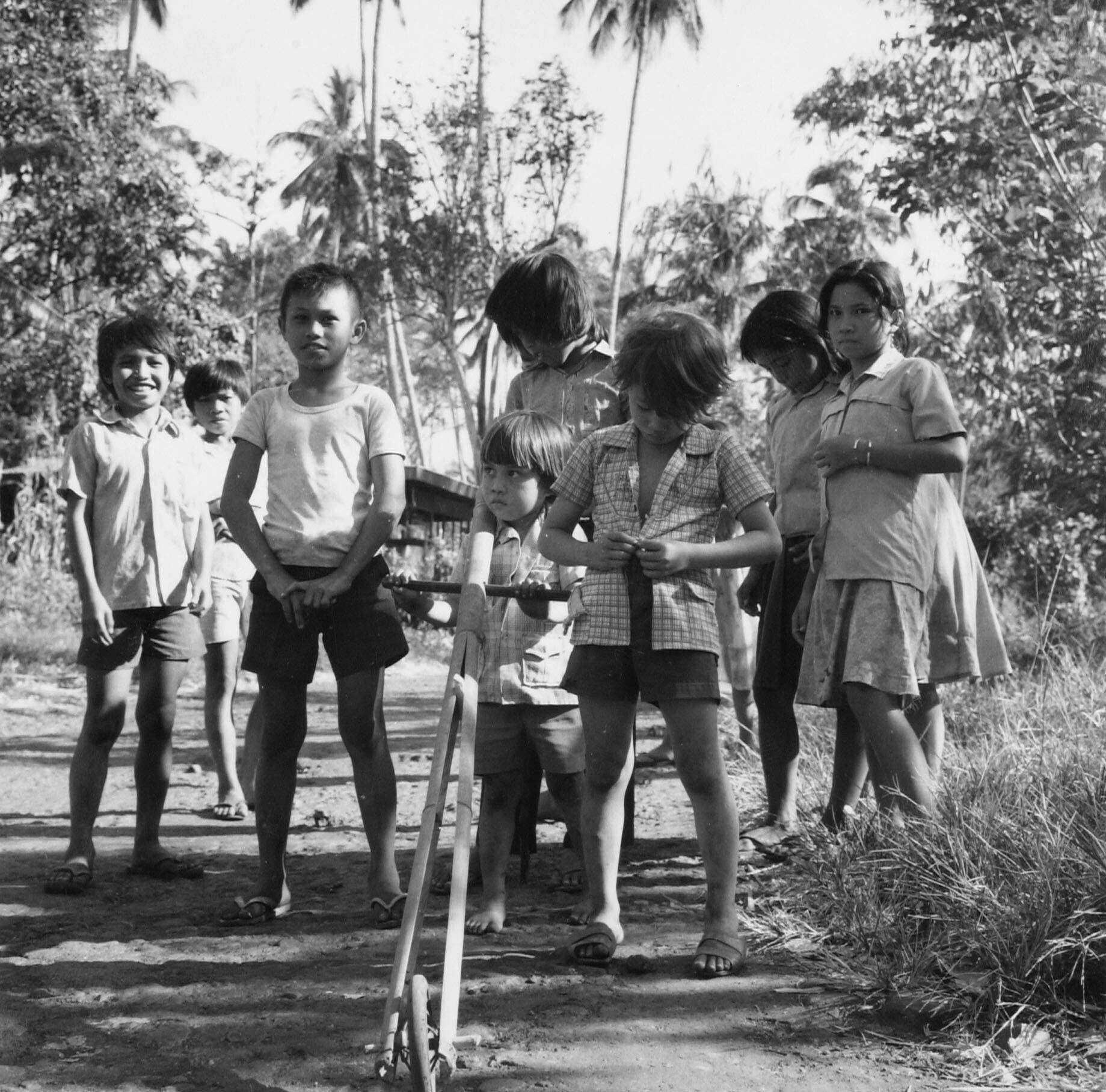 Een zwartwitfoto van vier kinderen in het dorp Ullat...