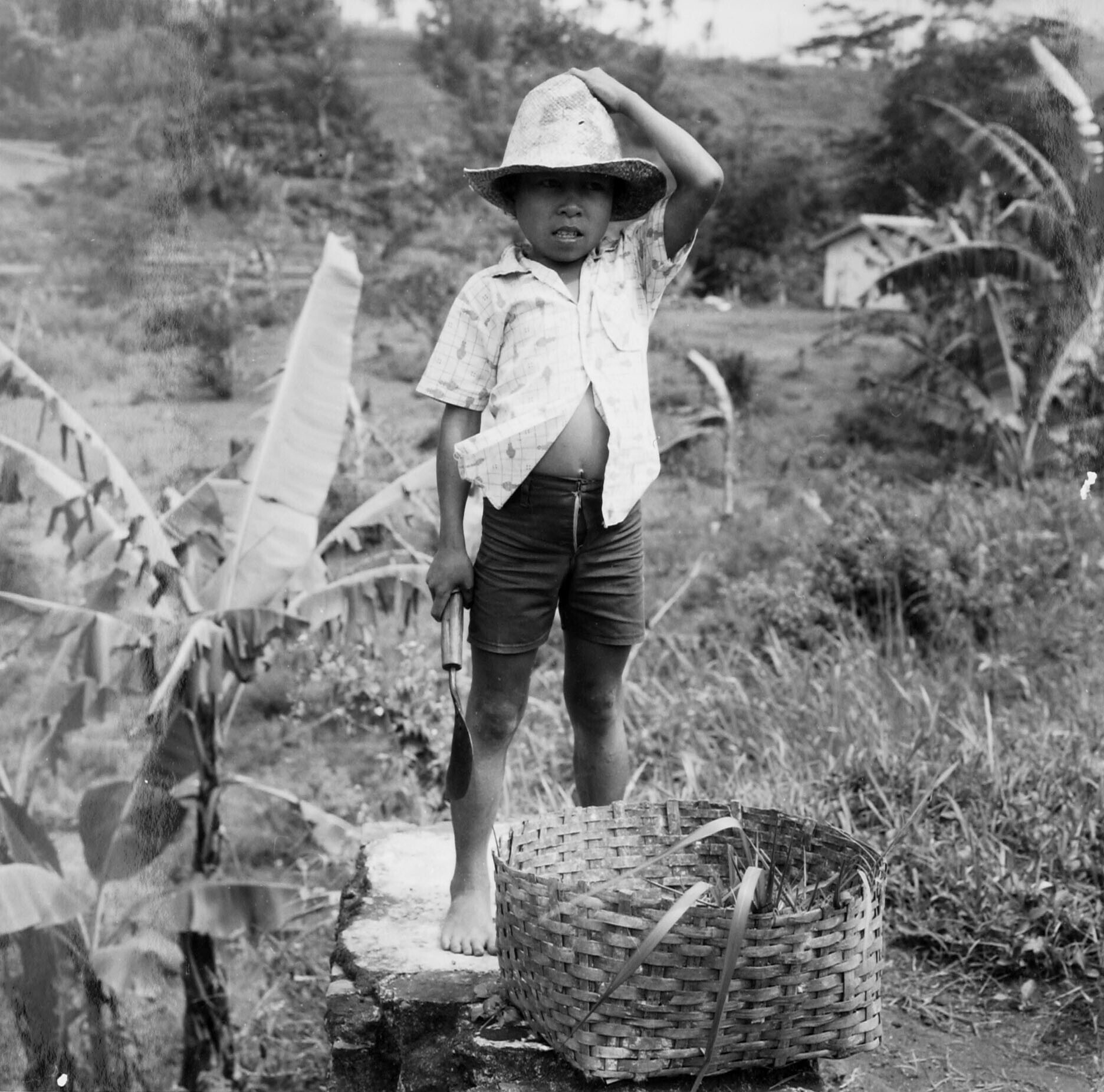 Portret van een jongen met strohoed, grasmes en mand