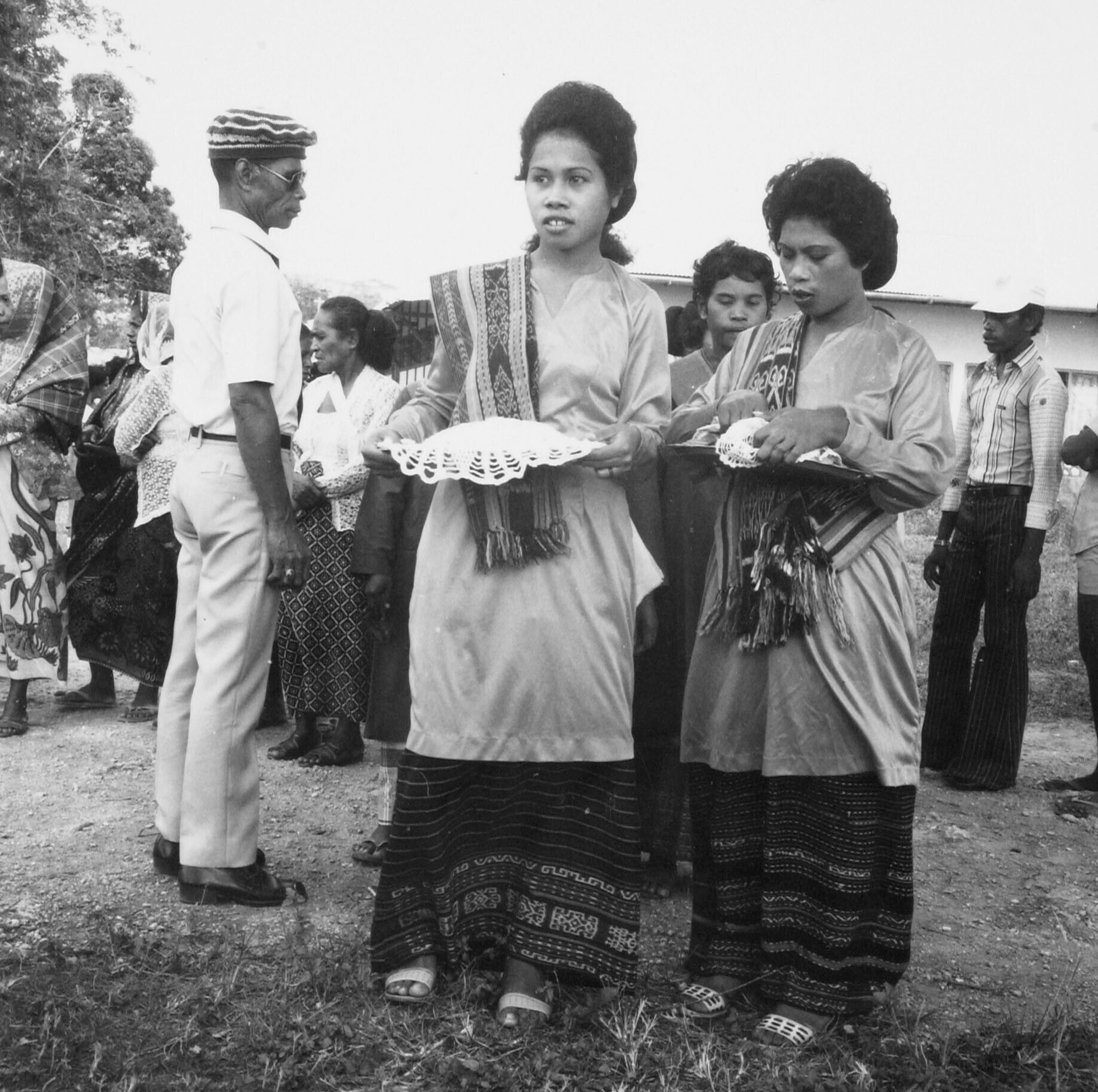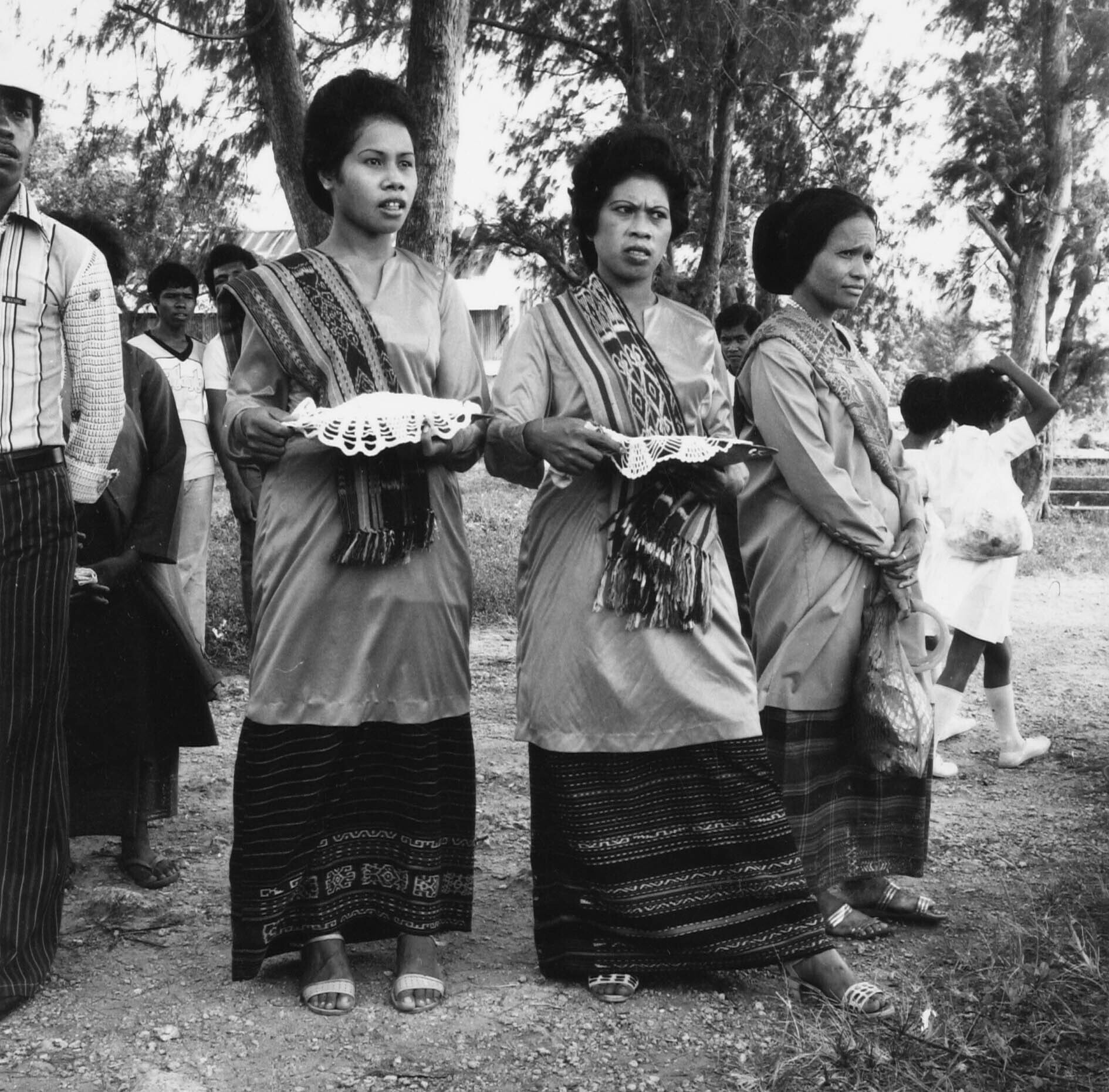 Vrouwen in feestkleding wachten tijdens een roeiwest...