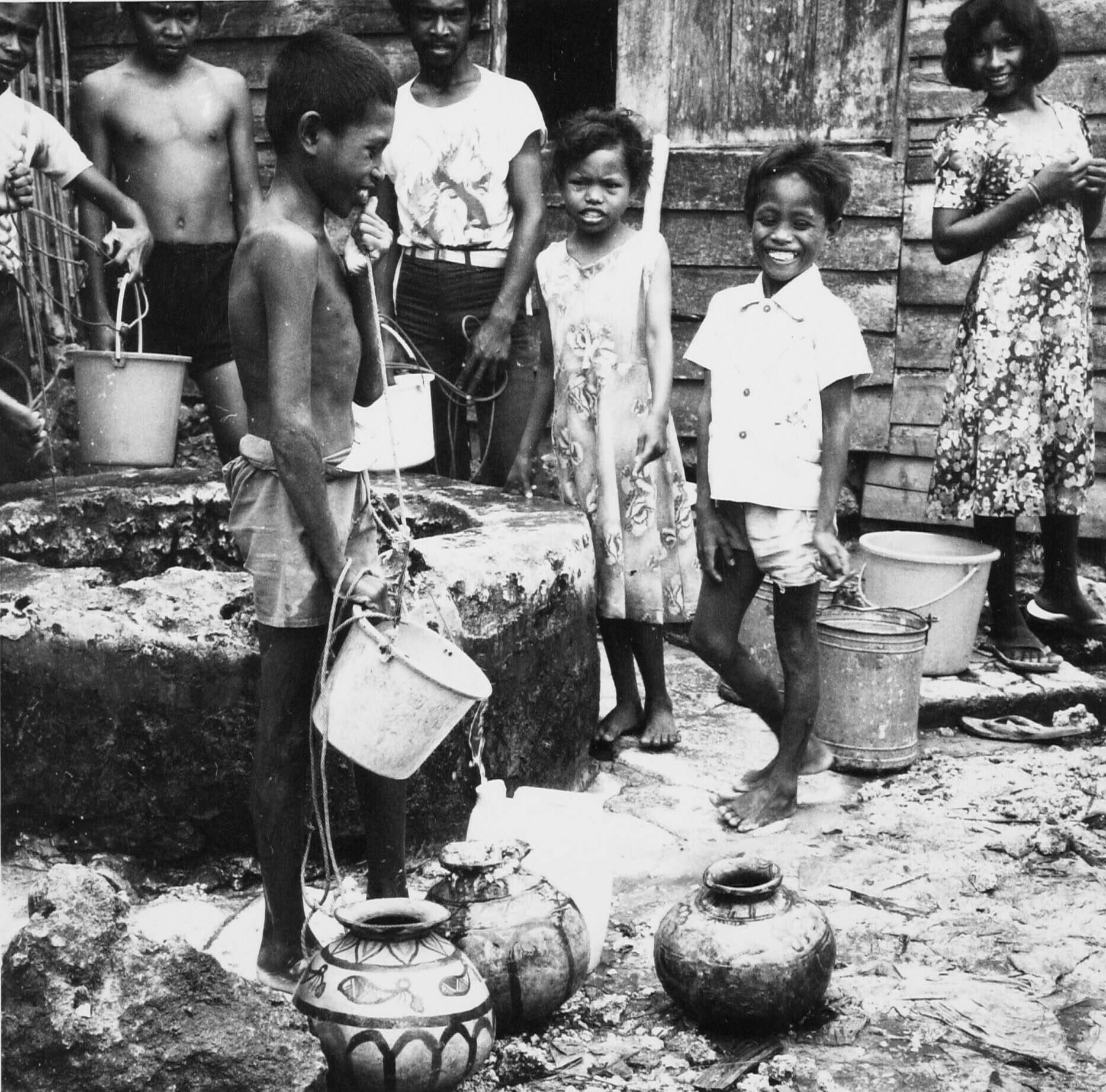 Mensen bij de gemeenschappelijke waterput achter de ...