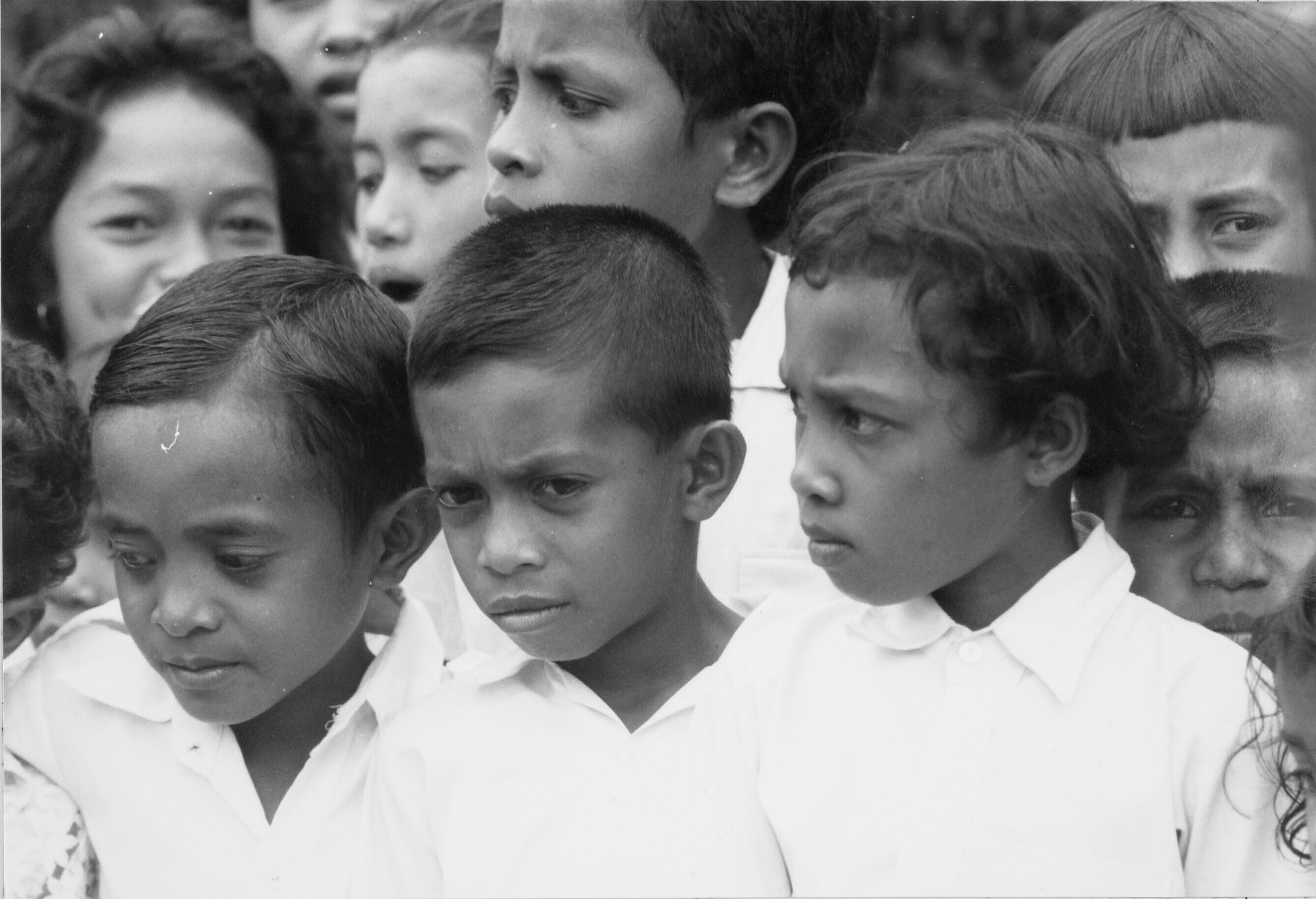 Een zwartwitfoto van een aantal schoolkinderen uit h...