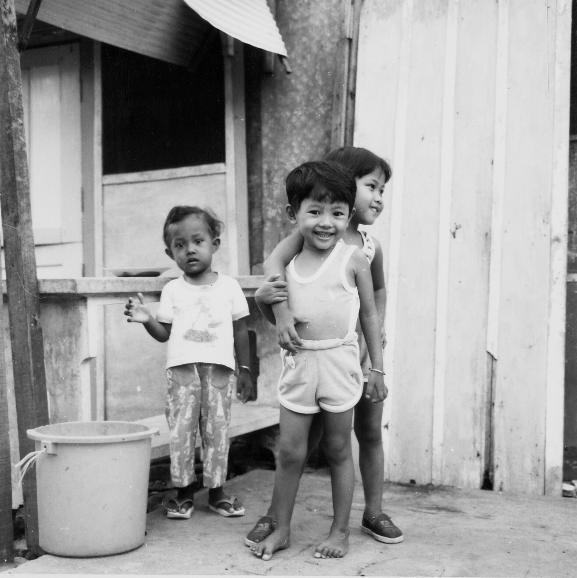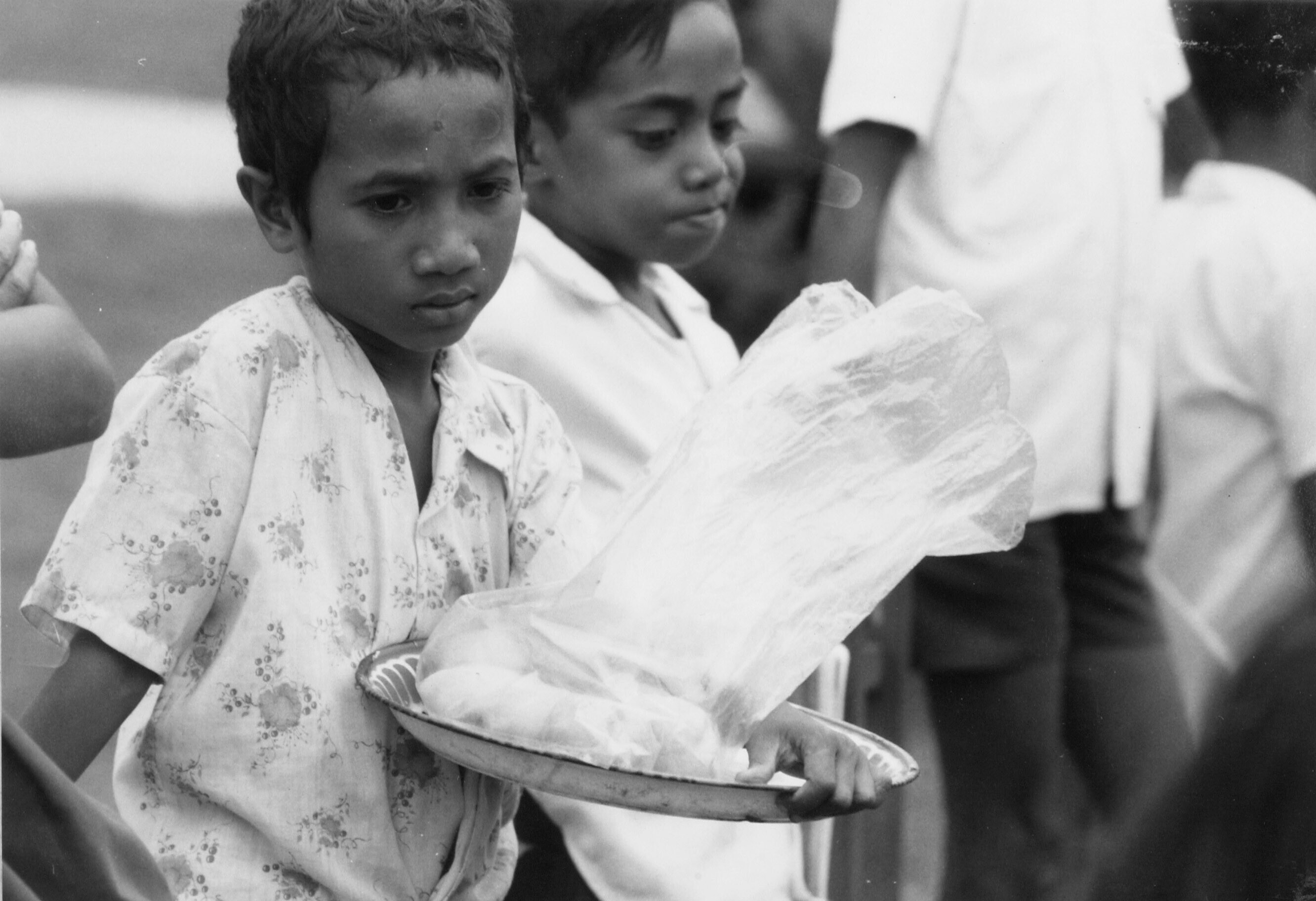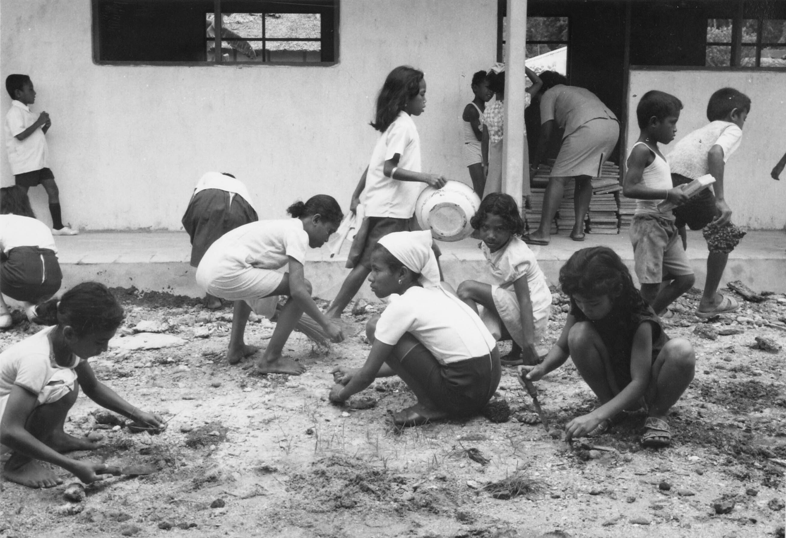 Een zwartwitfoto van kinderen, die het vuil wegdrage...