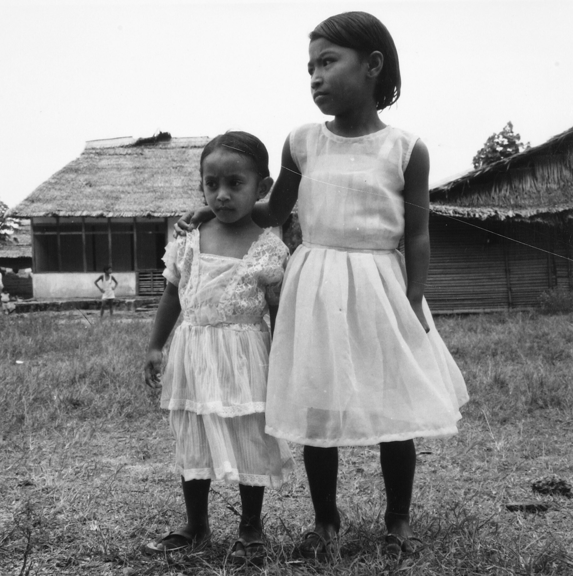 Een zwartwitfoto van twee meisjes in hun zondagse kl...