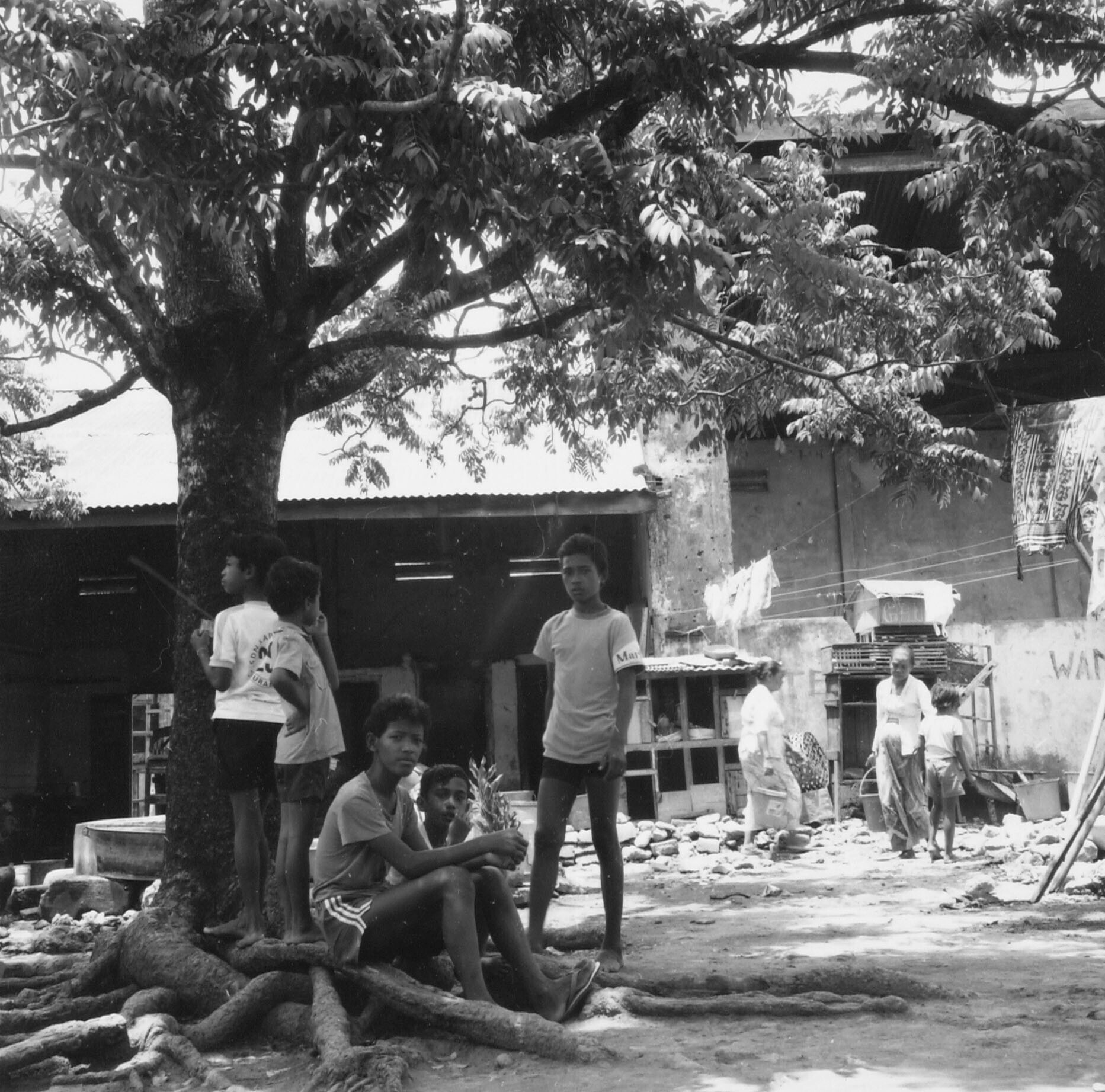 Jongens onder een boom op straat