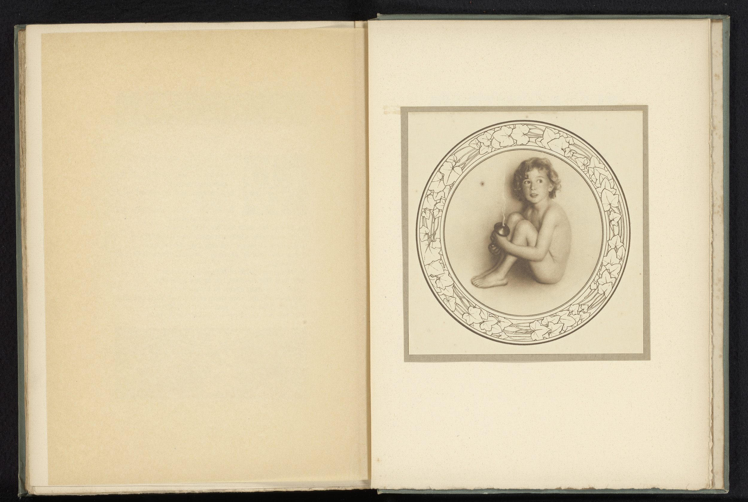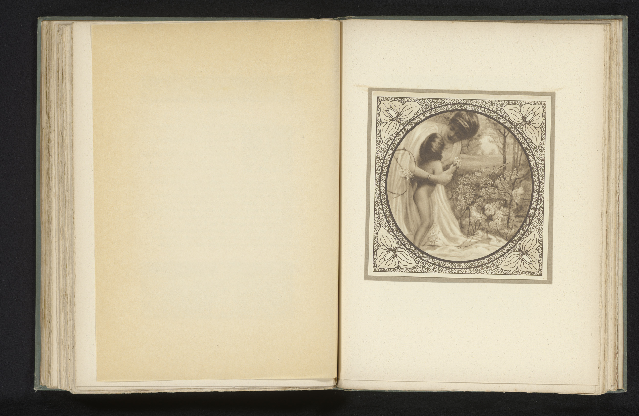 Vrouw met naakt kind in een landschap, omlijst met b...