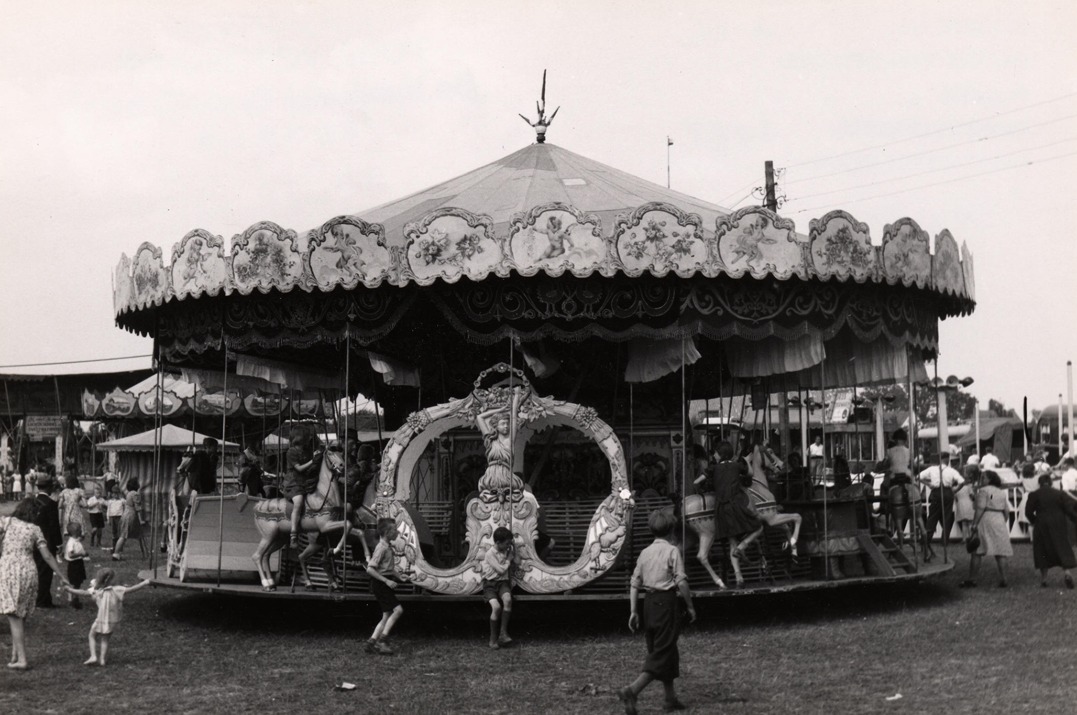 Draaimolen op de kermis, Huissen, 1947 (zwart-wit foto)
