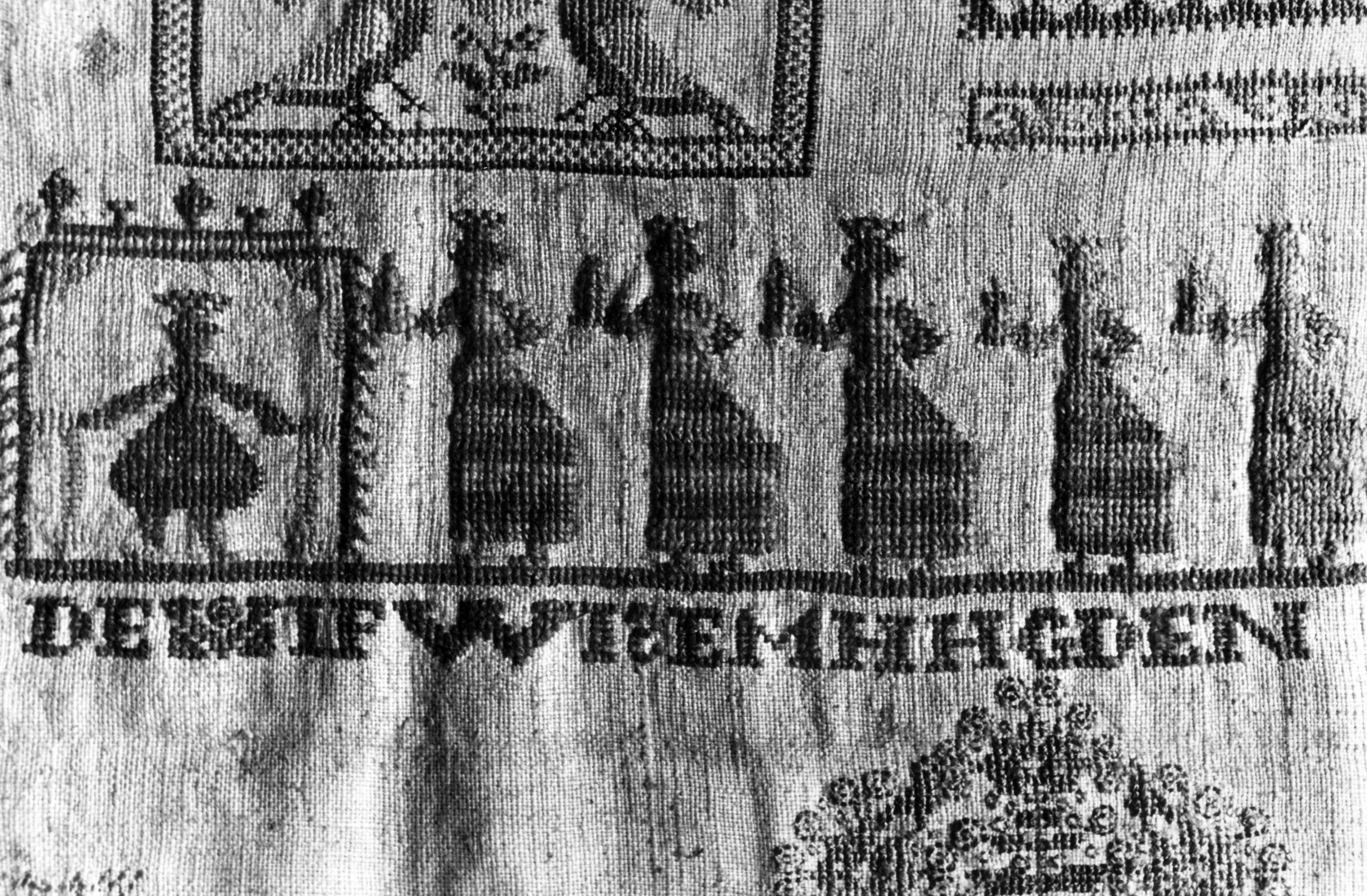 Detail van een merklap uit 1640, Marken, 1943 (zwart...