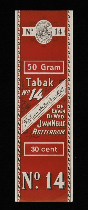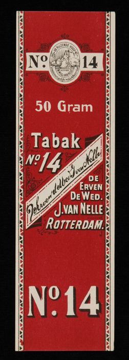 Donkerrood label VAN NELLE TABAK, No. 14, 50 gram, 30¢