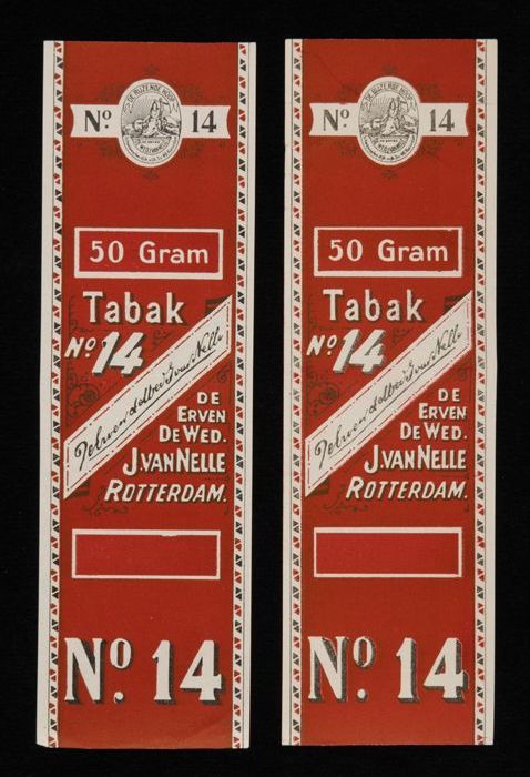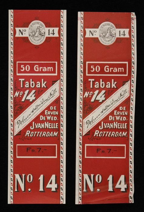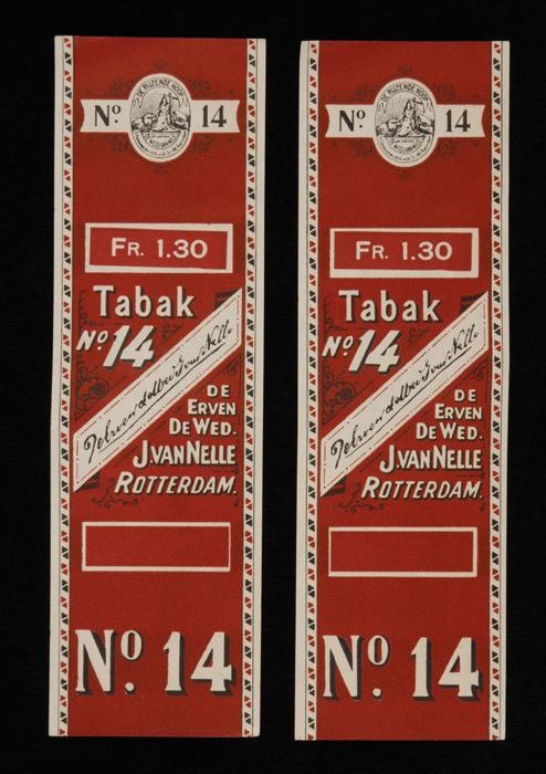 Twee donkerrode labels VAN NELLE TABAK, No. 14, fr. ...