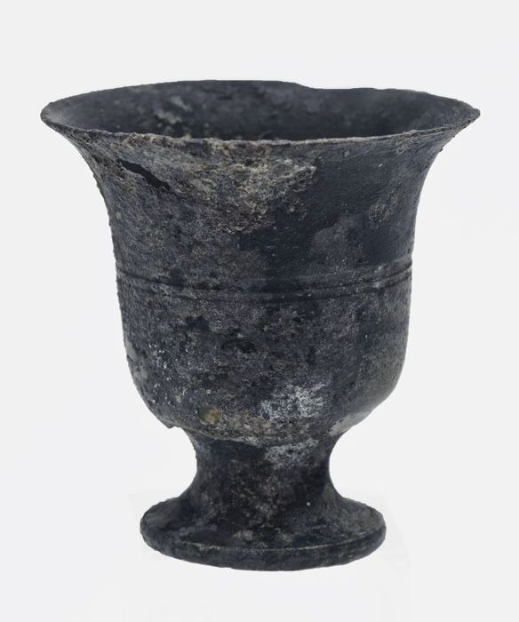 Kleine tinnen bokaal op standvoet, ringen rond de bu...