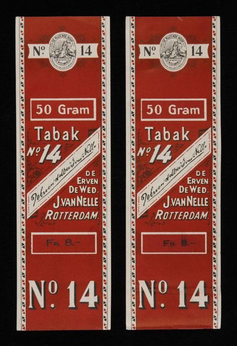 Twee donkerrode labels VAN NELLE TABAK, No. 14, 50 g...