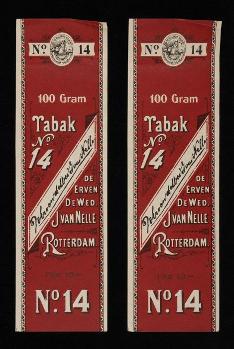 Twee donkerrode labels VAN NELLE TABAK, No. 14, 100 ...